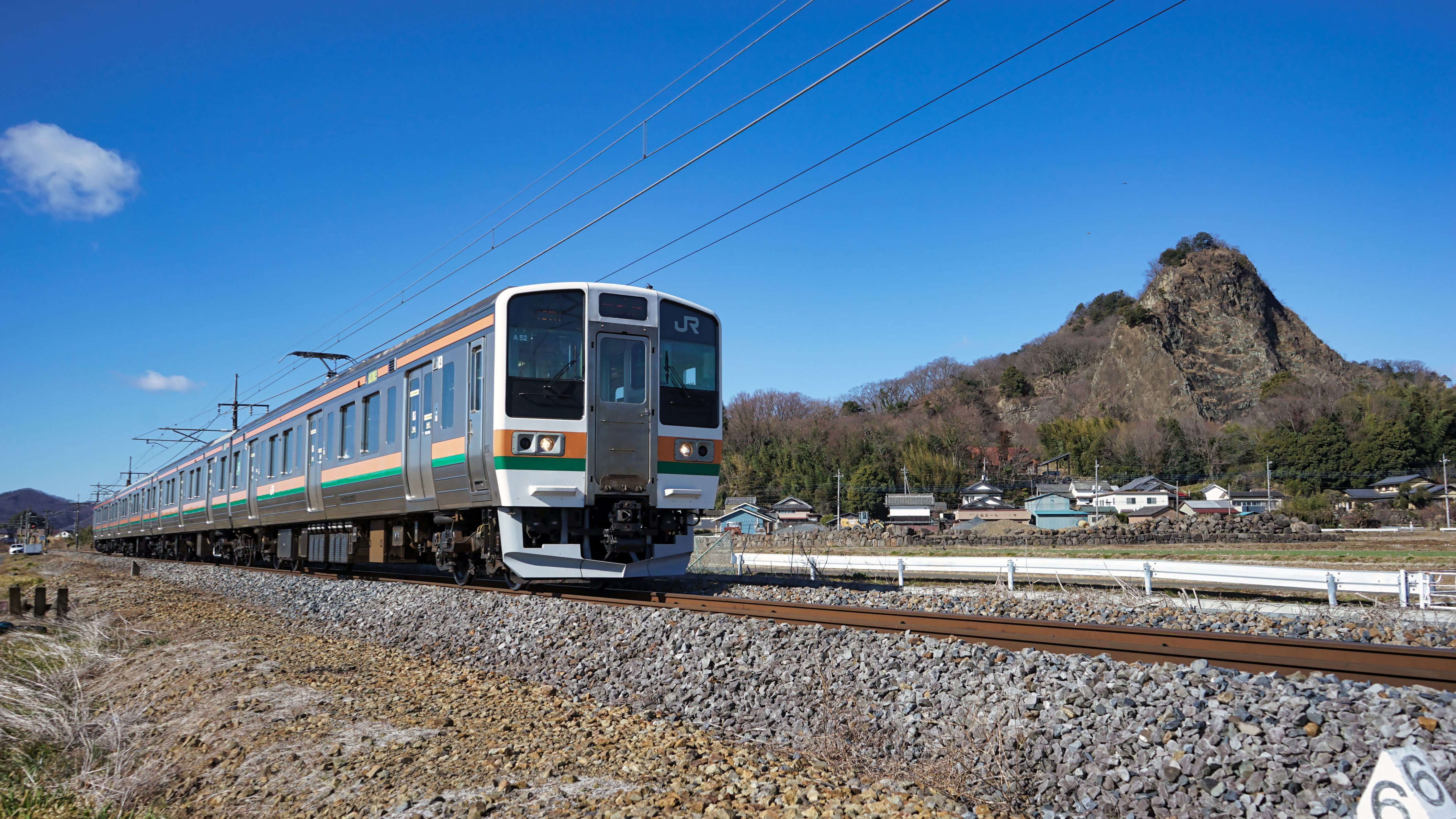 岩舟~思川 国鉄211系 普通列車A52編成 後方の山は岩船山 採石場跡地では戦隊もの爆破シーンの撮影地として有名。現在は爆破体験ツワーなど行われている。