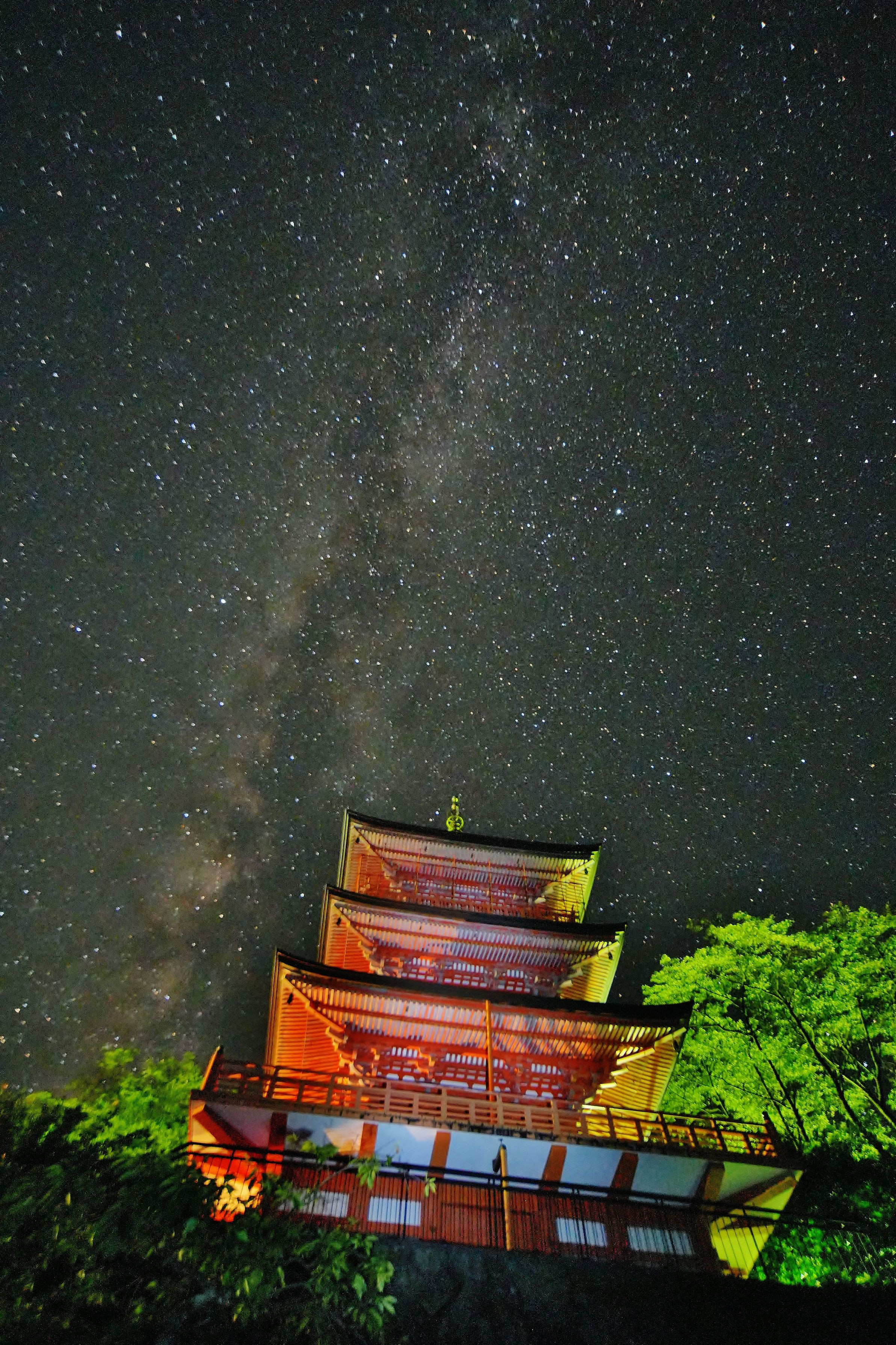 ライトアップされた反対側からライトを当てて撮影しました。丁度天の川が良い角度に立ち上がる方向で、思っていた写真を撮影することが出来ました。