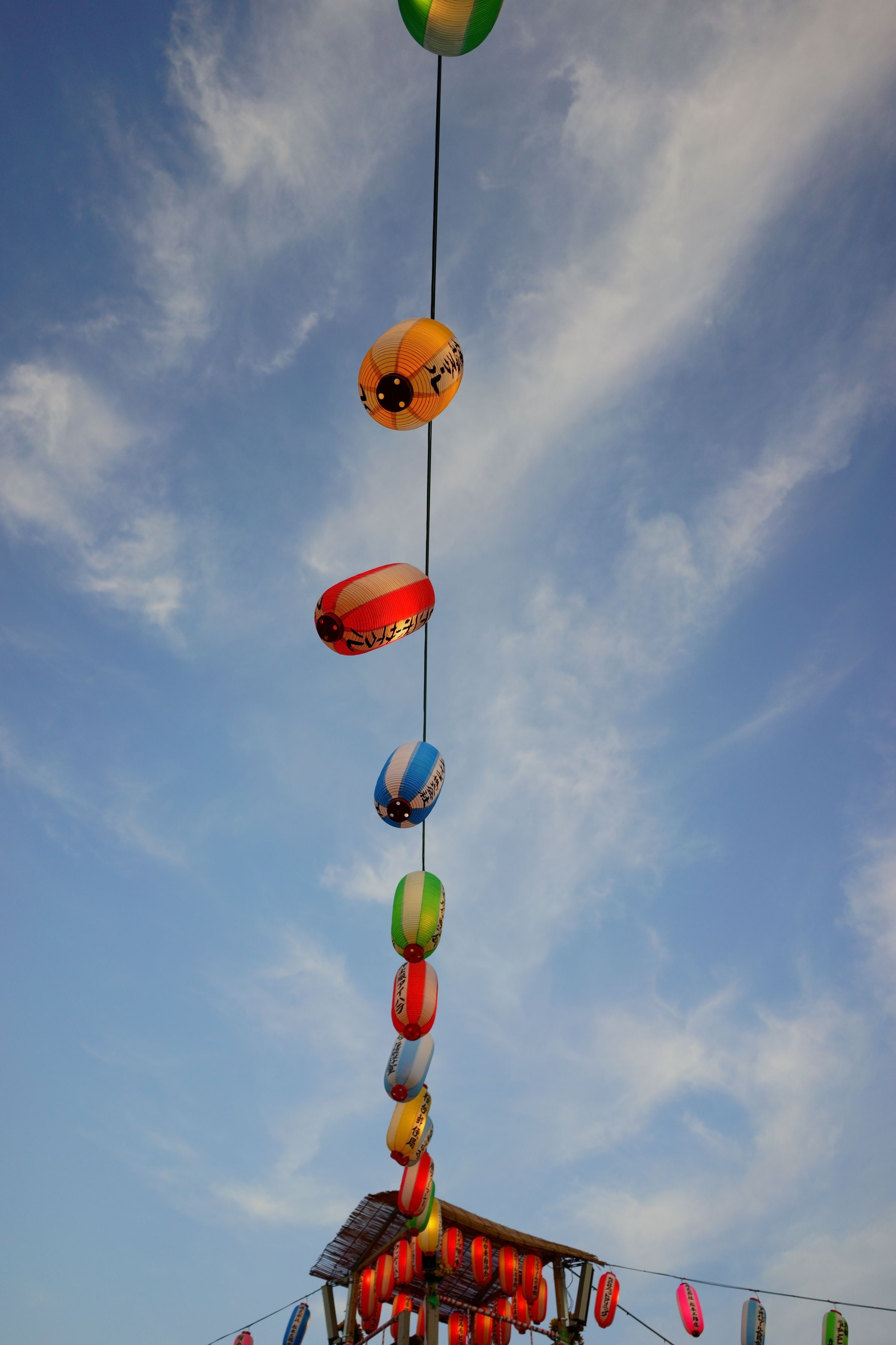 コロナで4年間開催されなかった地元のお祭りで撮った提灯と青空。