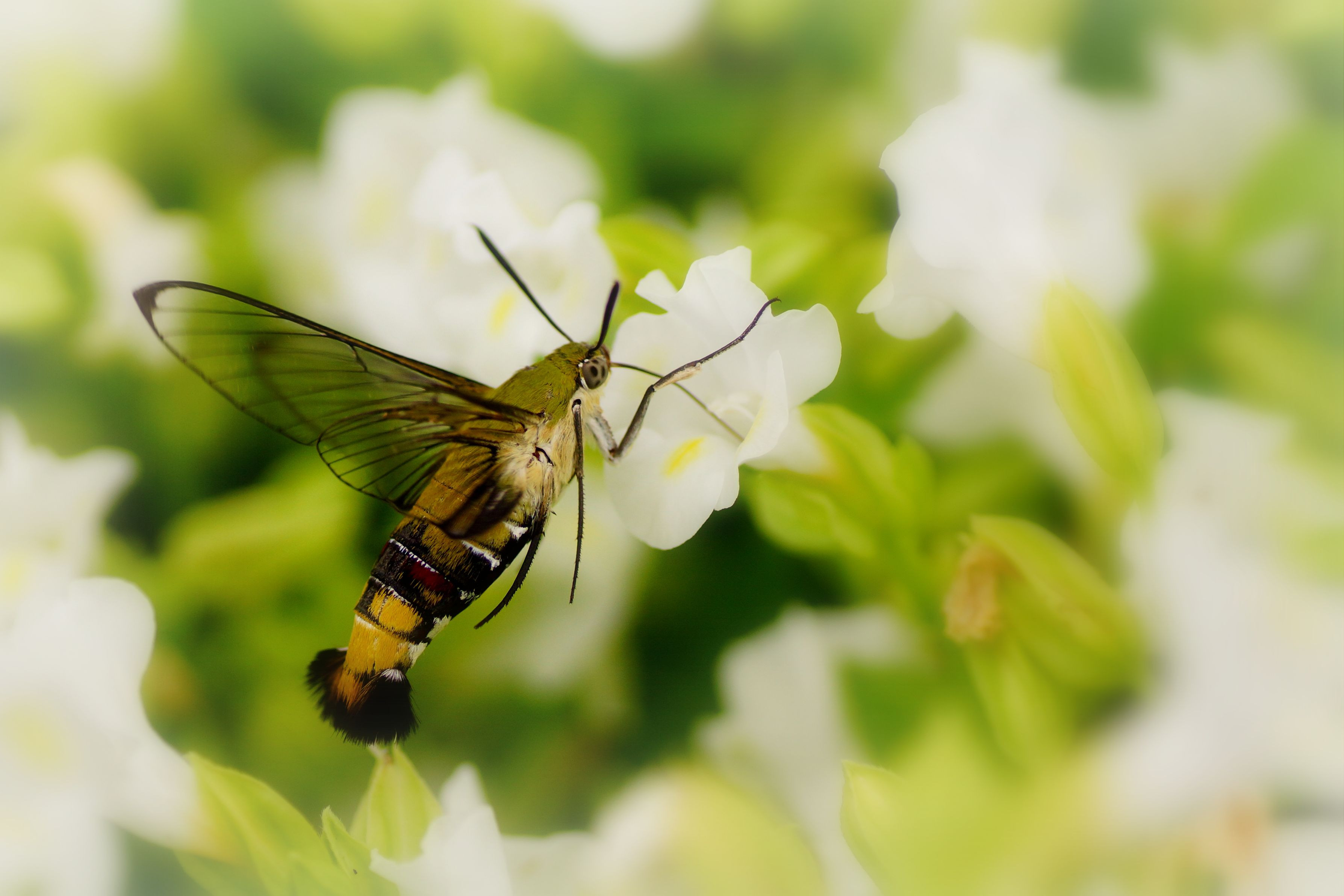トレニアのお花畑でお食事中のオオスカシバです。 (位置調整のため若干トリミングしてます)