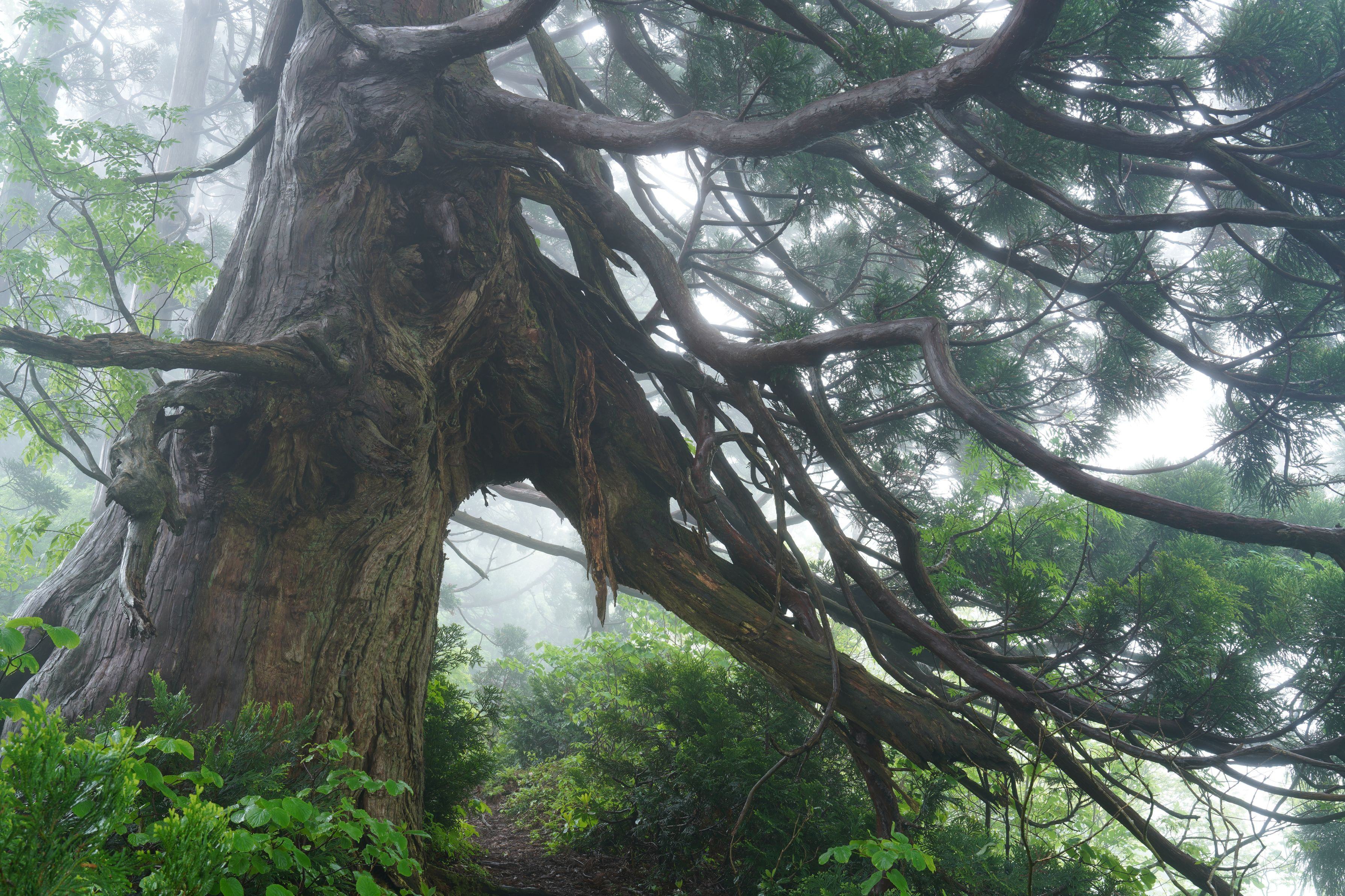 名前もない巨大な杉の木。尾根に堂々とそびえ、前に進むには幹と枝の間をくぐり抜けていく。自分の疲れた体がリセットされる気がした。