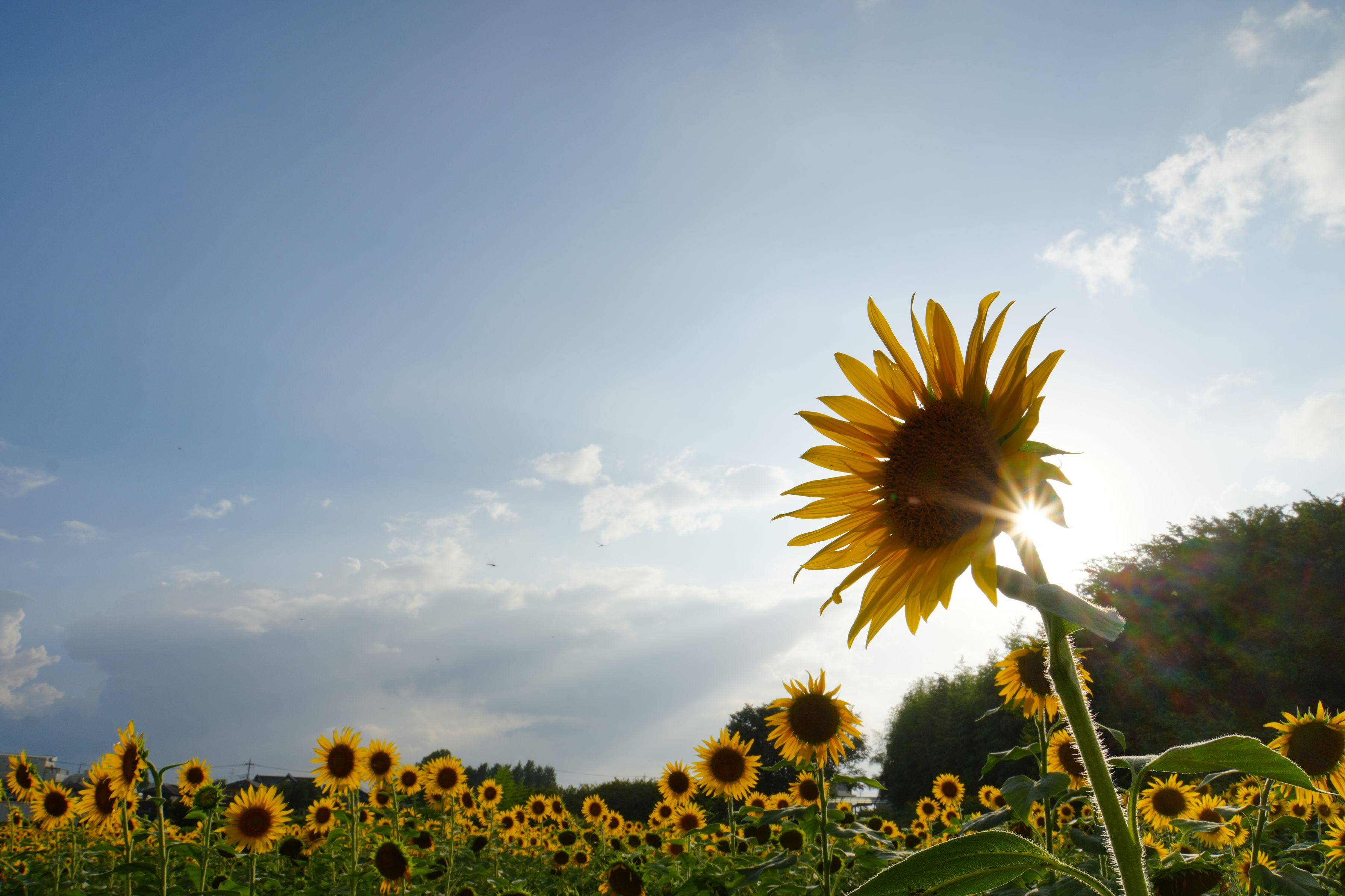 埼玉県所沢市三ケ島のひまわり畑にて 台風の影響で降ったり止んだりの中、 ようやく差した光
