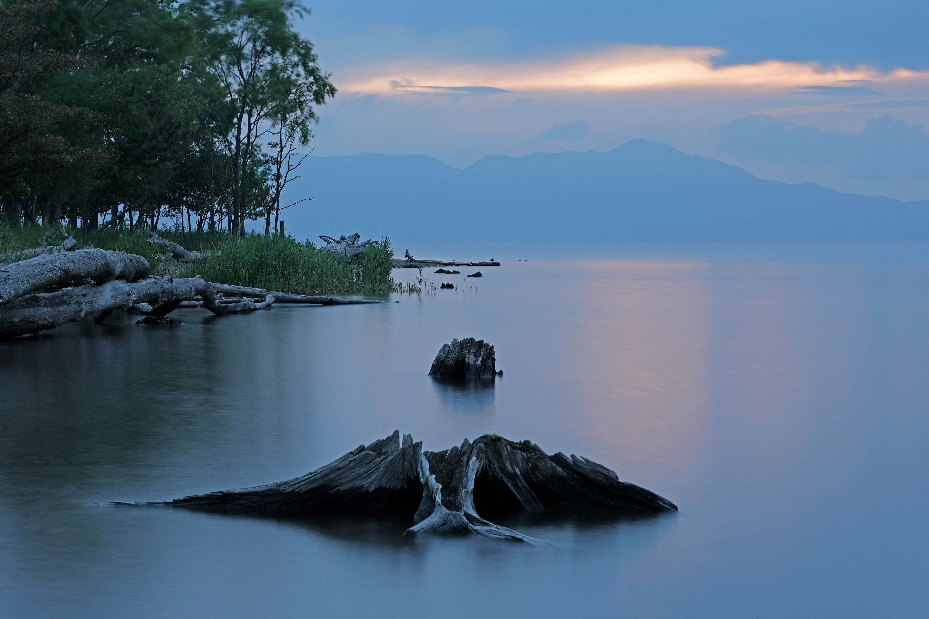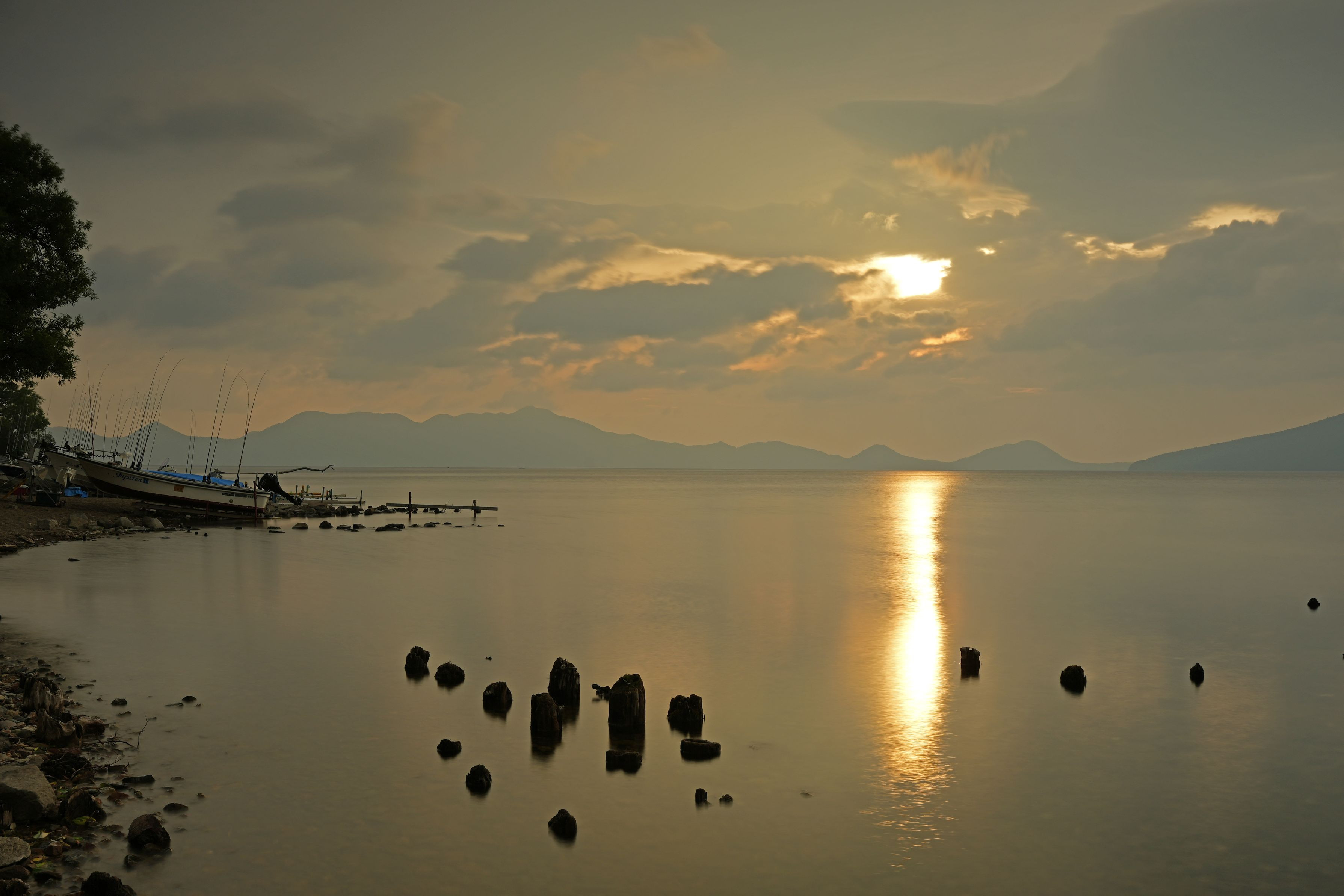 早朝の支笏湖。 朝日が雲間からのぞくのを期待しましたが残念ながら太陽は姿を見せませんでした。