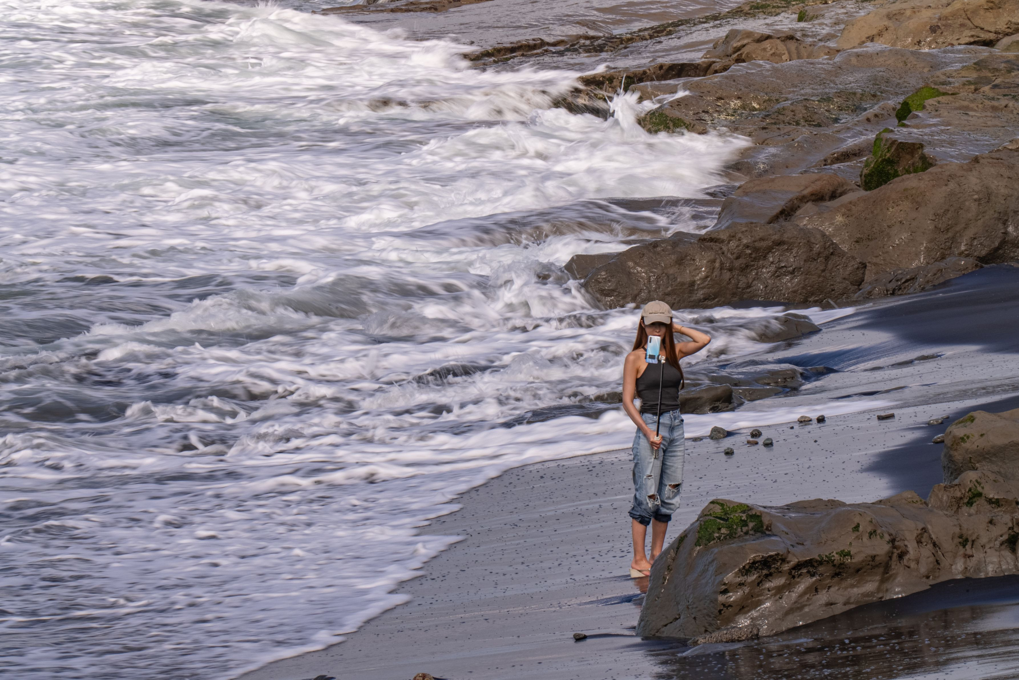 稲村海岸沿いに波に濡れながら歩く女性がいた。そして立ち止まると、泡立つ波を背景にポーズをとり、自撮りを始めた。