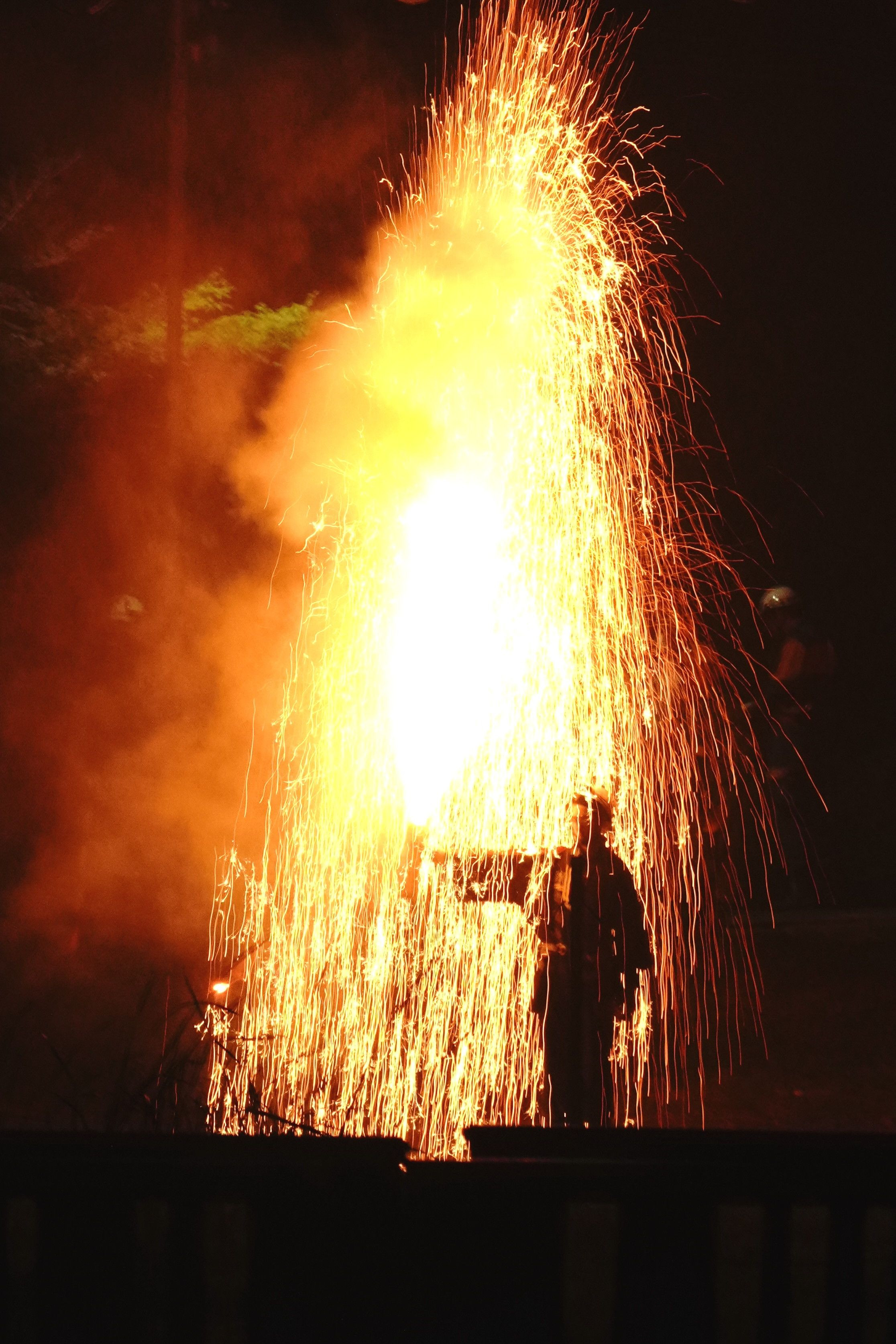 熱い火花が散る中にて立続ける花火師