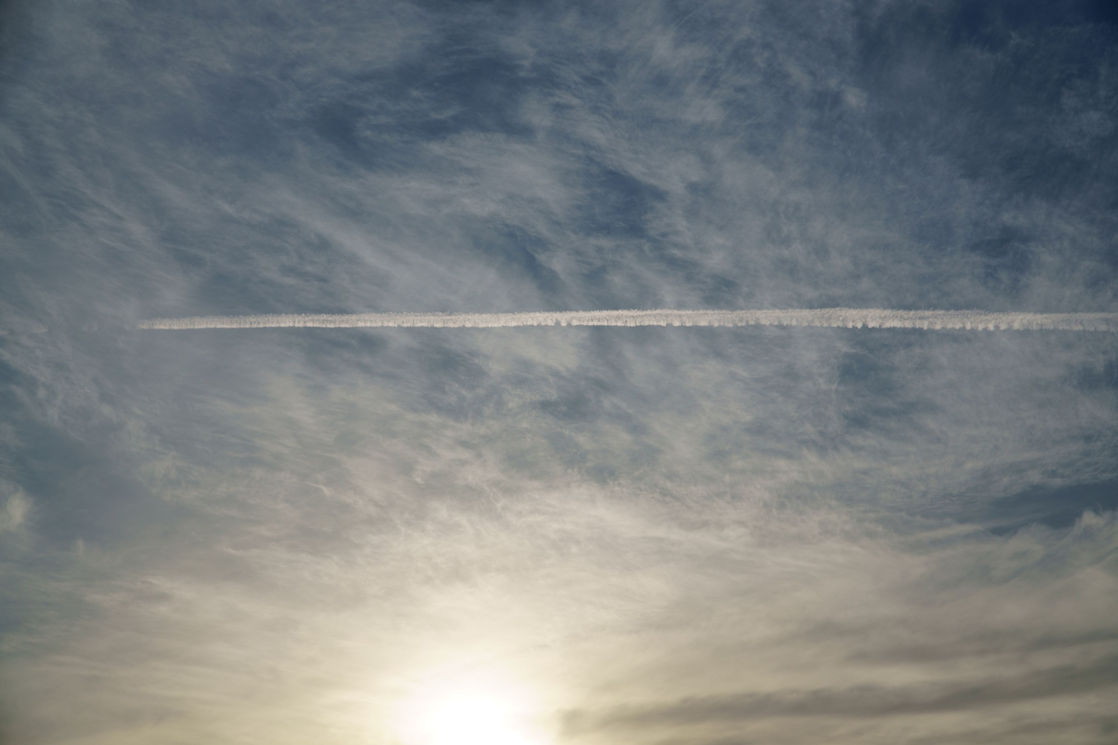 目の前を飛行機が通り過ぎて行ったけれど。少し時間が経過した飛行機雲の方が綺麗だった。