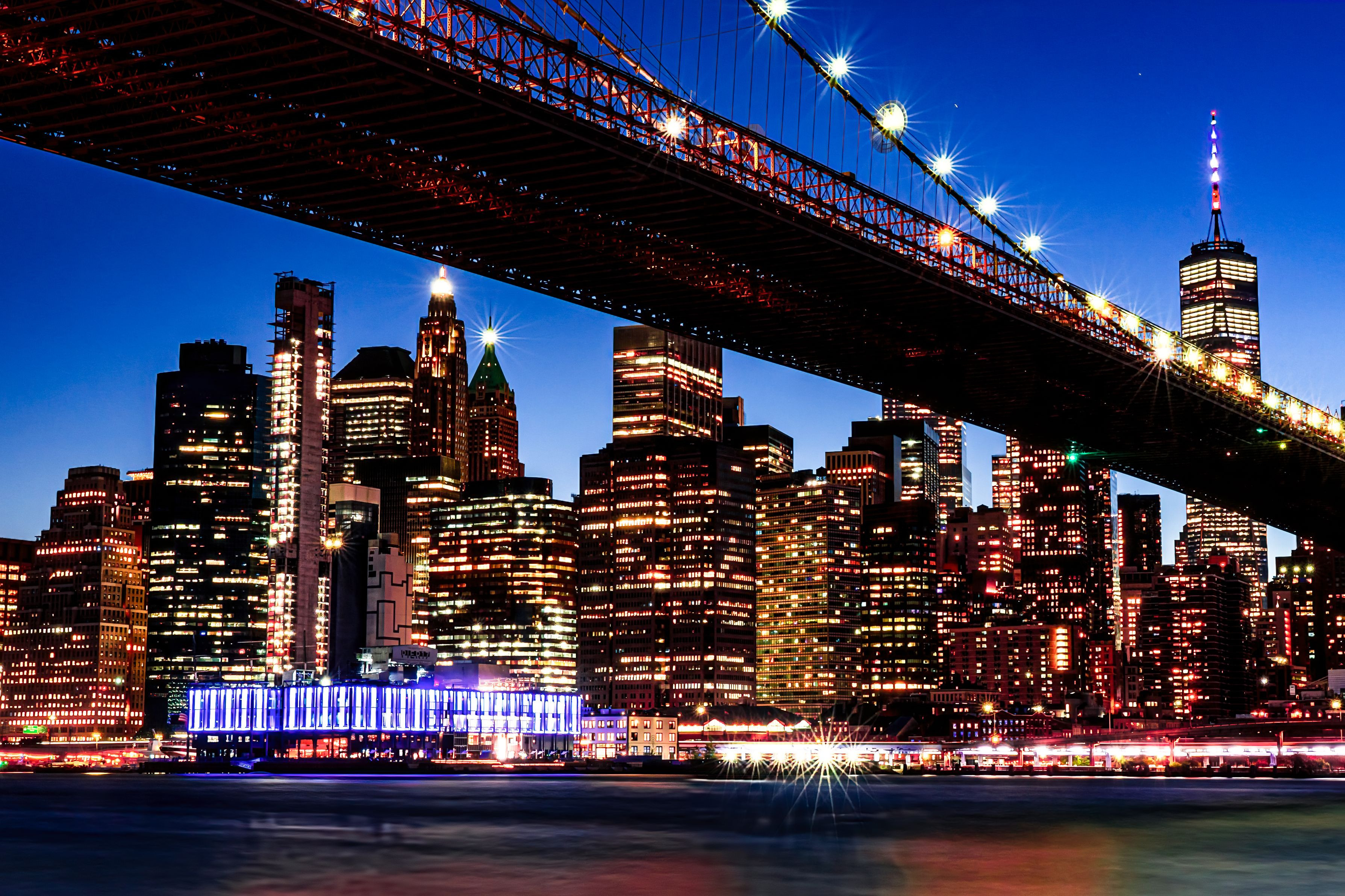 ニューヨークマンハッタンの夜景を、ブルックリン橋のたもと、フルトン・フェリー公園から撮ってみました。