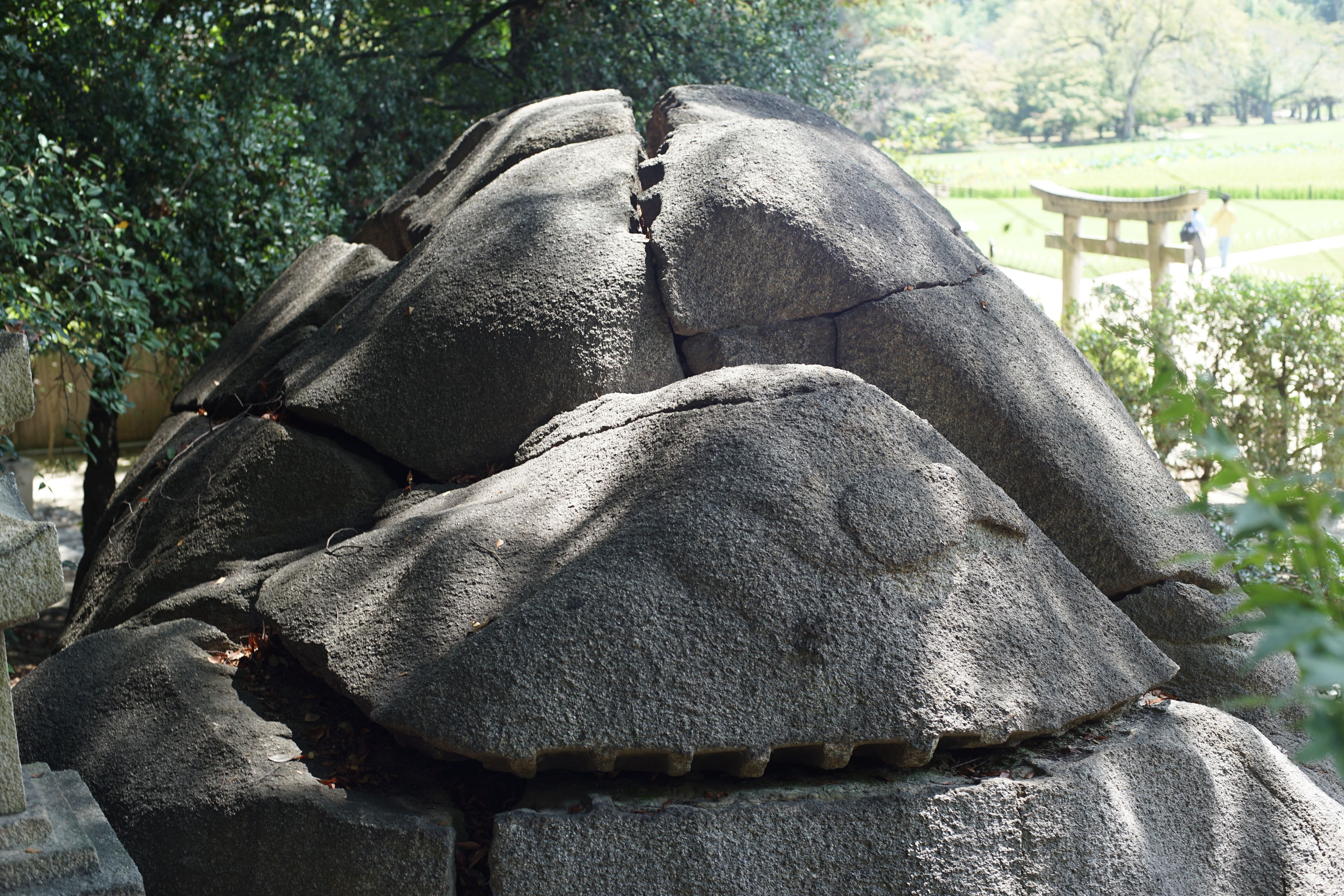 岡山県後楽園の慈眼堂のそばにある烏帽子岩です。元の花崗岩を36個に割って運び、組み上げたものなんだそうです。こんな岩が、後楽園にはまだあります。 説明では、再現技術の高さが書かれていましたが、そうまでしてこの大岩を、ここまで運んでこなければならなかったのはなぜなのか、よく分からないところです。
