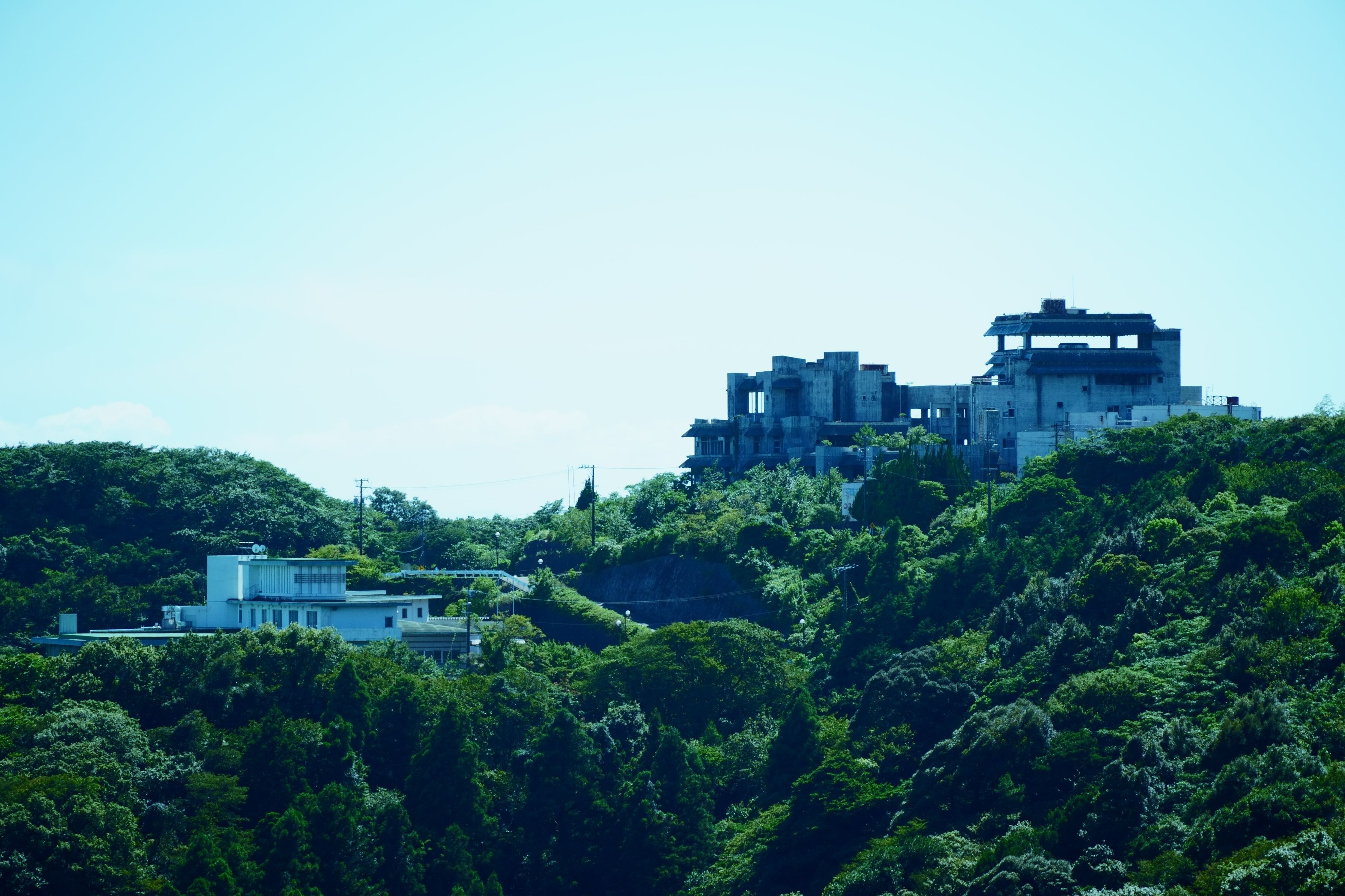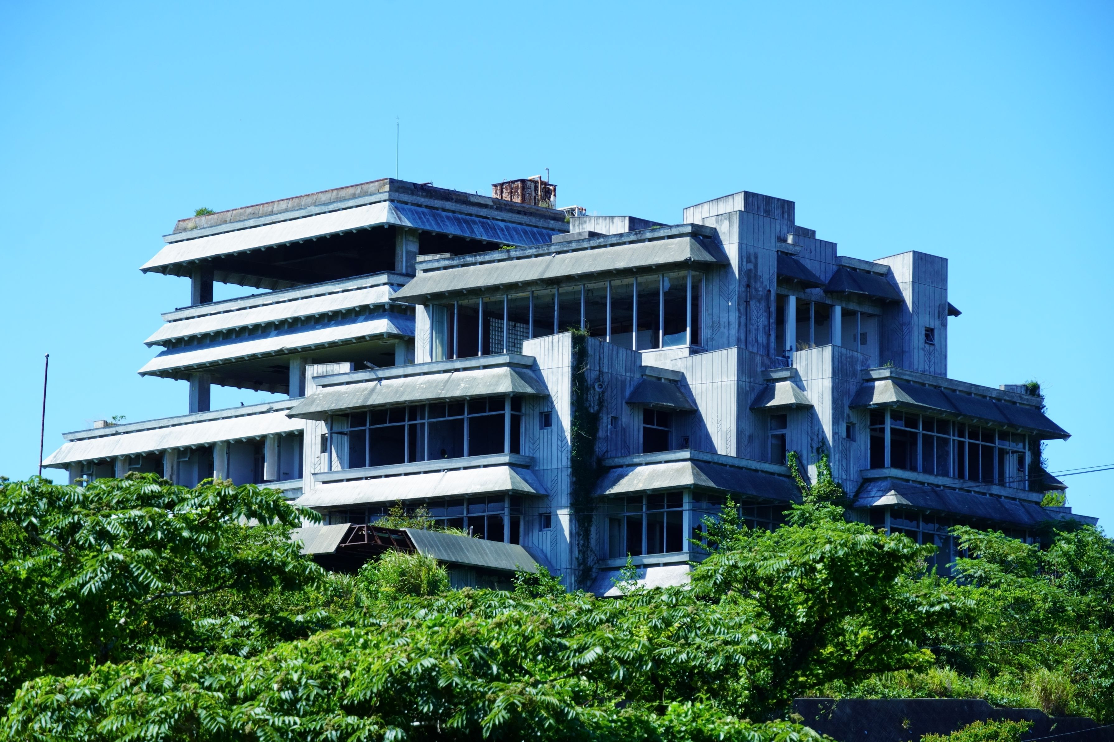 三ヶ根山スカイライン。 三河湾を一望できる絶景スポットではあるが、こんな謎の廃墟があるのも面白い。 横から見るとめっちゃデカイ。 不法侵入ダメ絶対ってことで、外観だけ撮影。