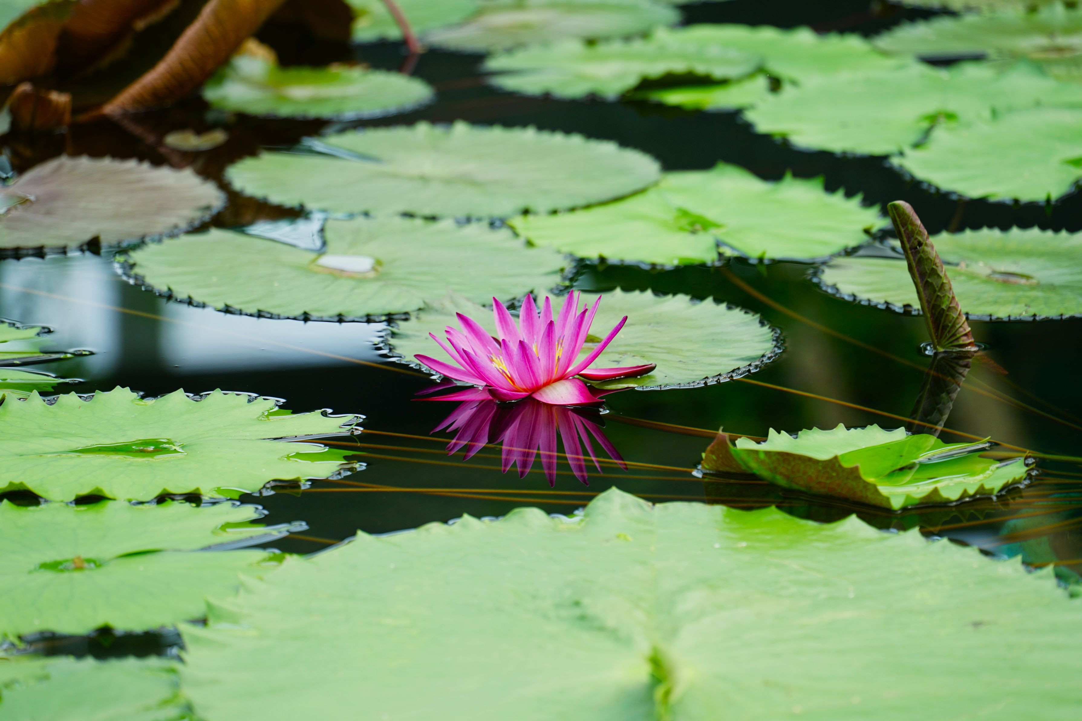 水面が鏡のように映るスイレンの花