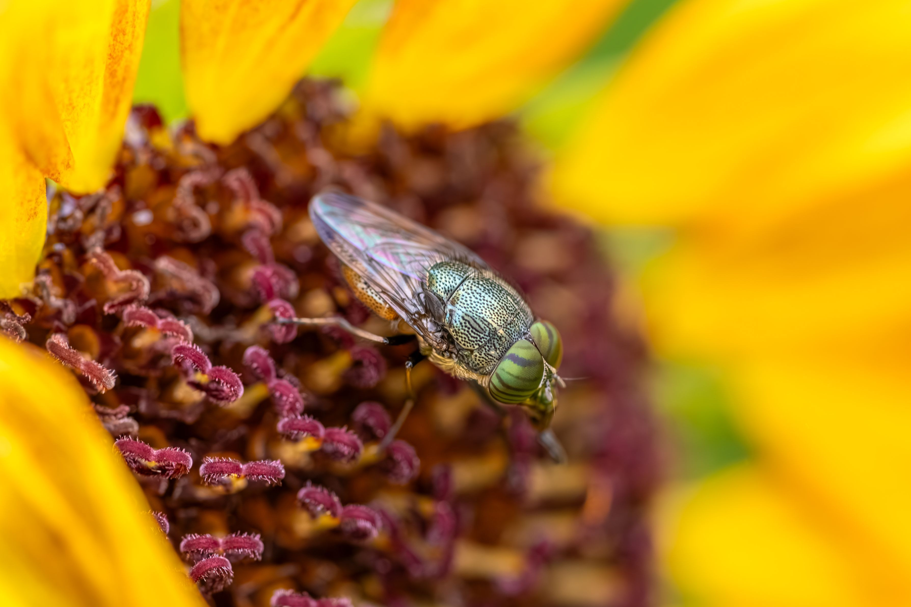 小さくて、キラっとしてて、くらいしかわからない小さな昆虫。 ひまわりの鮮やかさと相まって、落ち着いたグリーンと美しい複眼が際立ちます。 2023年の夏は、長く暑く大変ですが、虫が被写体である時間が長く嬉しいです。