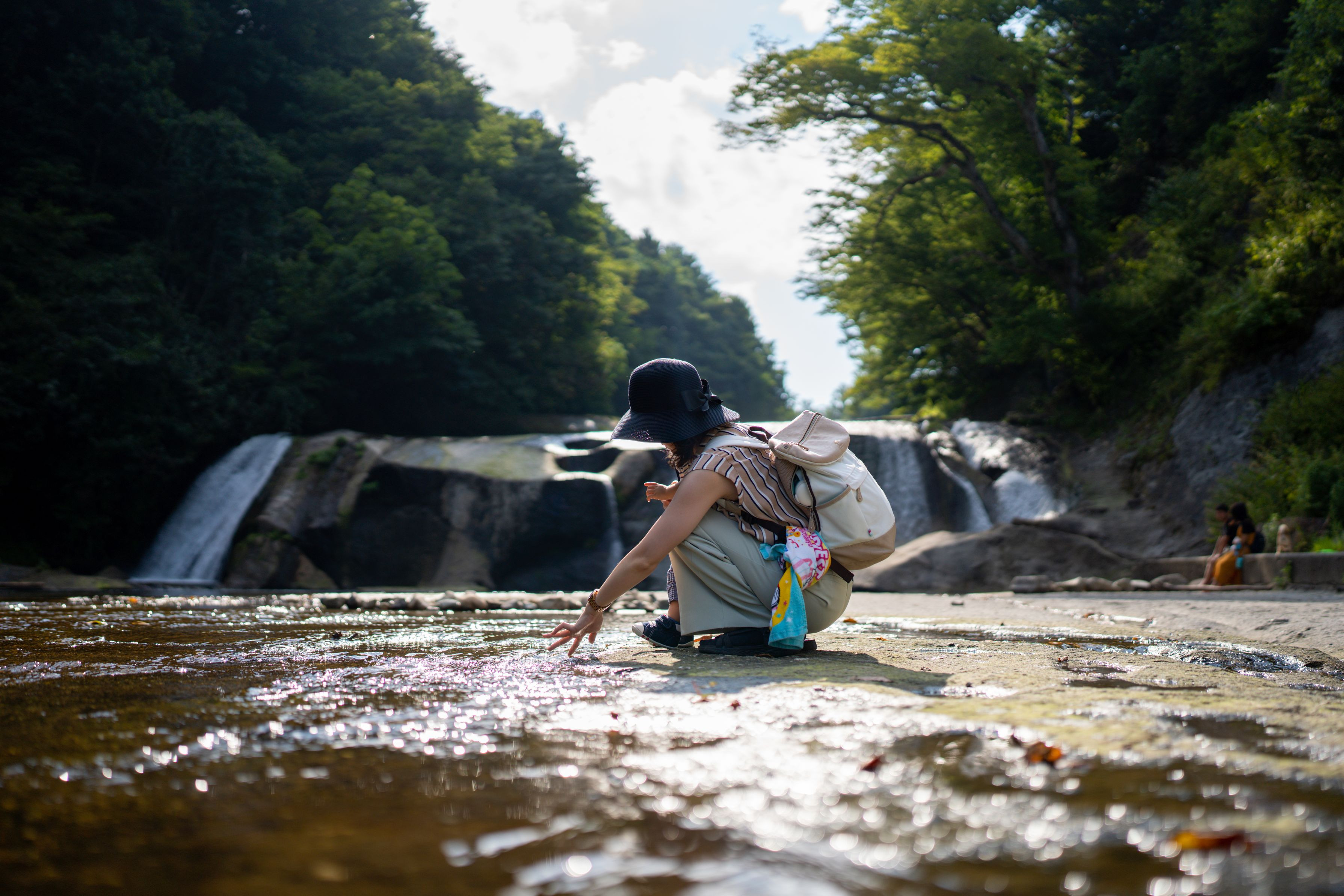雨不足で滝の水量が少なく、小さい子でも川辺まで行けました。