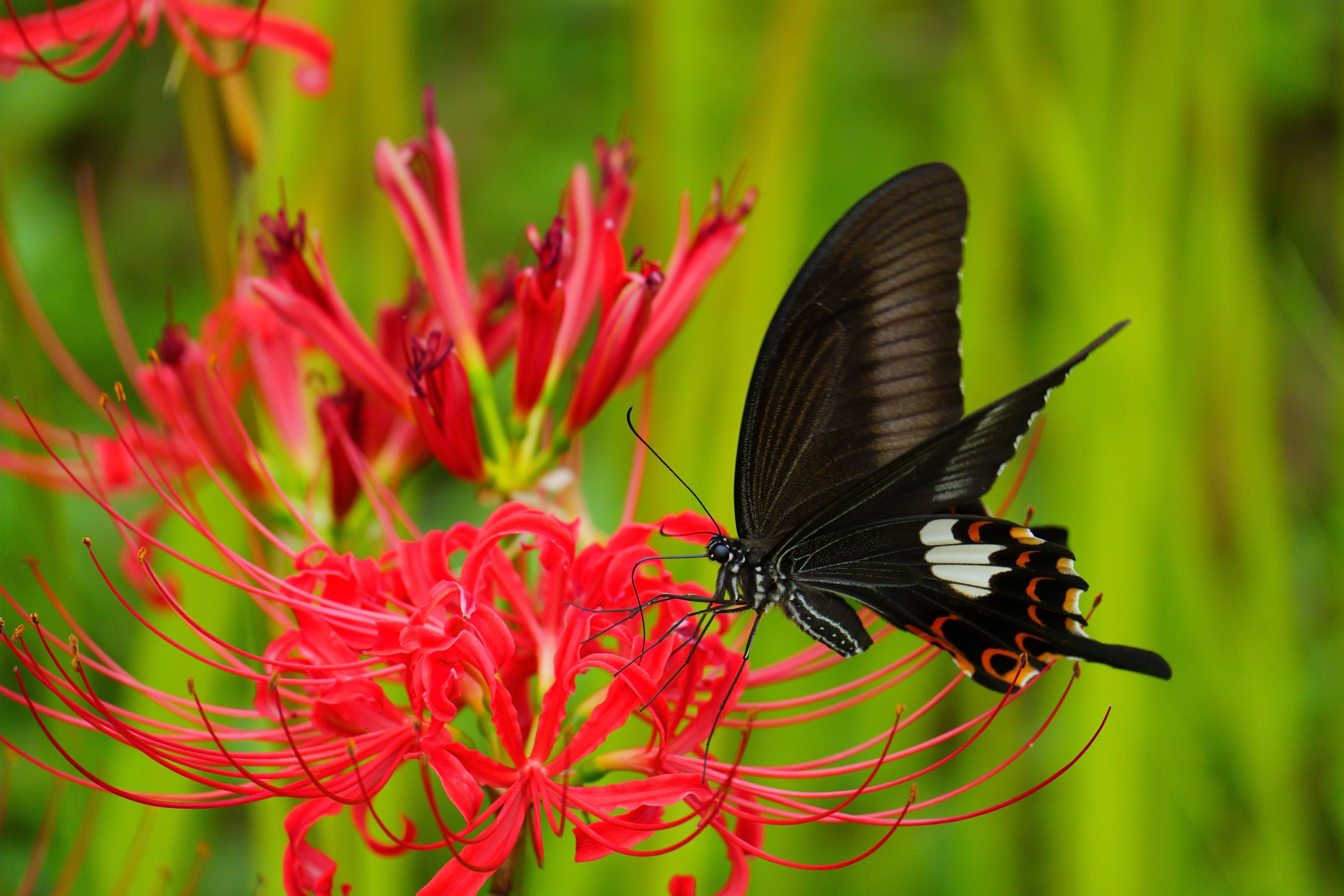 ヒガンバナによく黒いアゲハ蝶がやってきますが、今回のは大きいアゲハだなと思い、帰ってから調べたら、モンキアゲハと出ました。