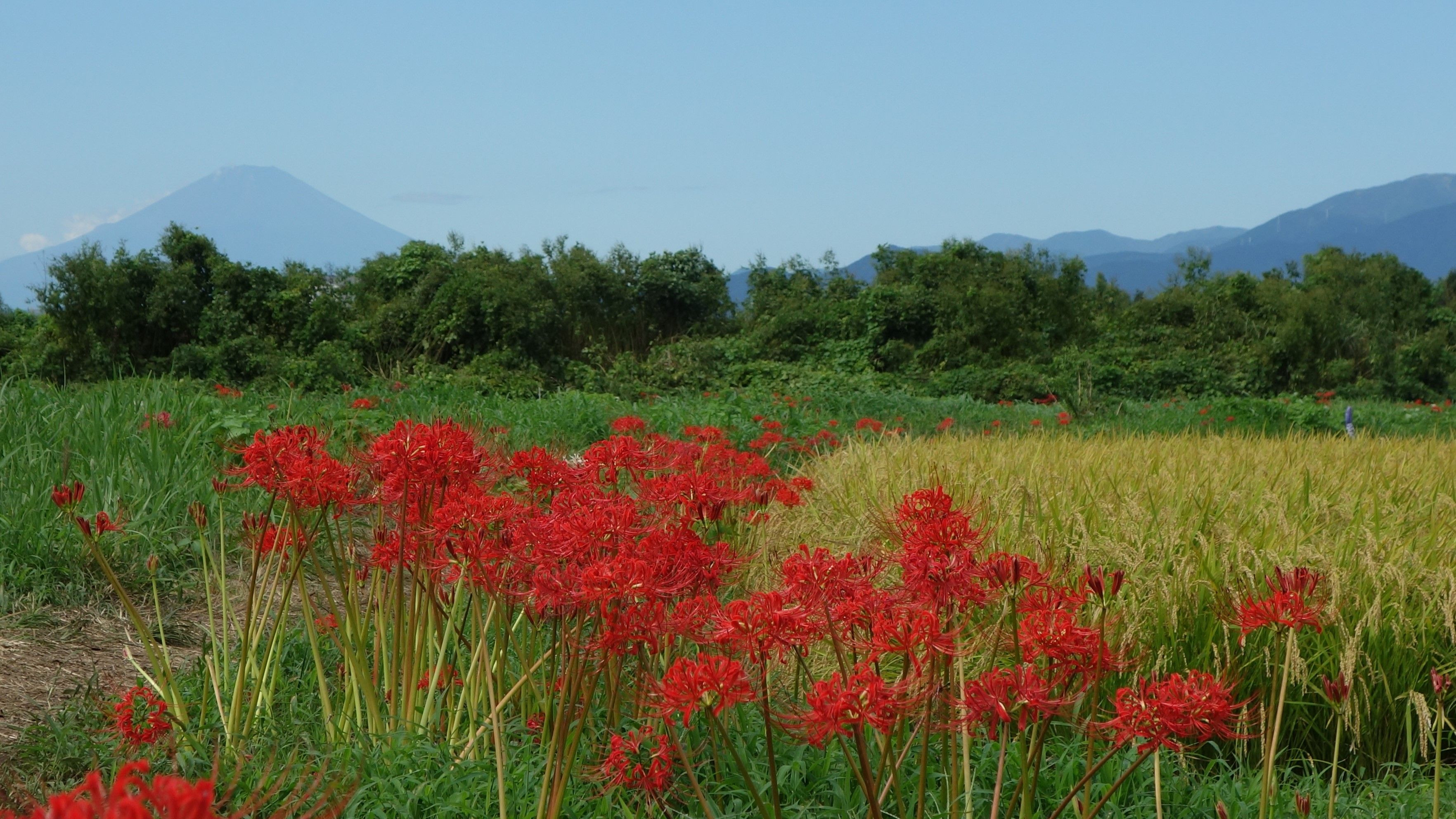 秋晴れの空の下、実りの季節を迎えた水田に富士山と彼岸花のカラフルなコラボレーション。