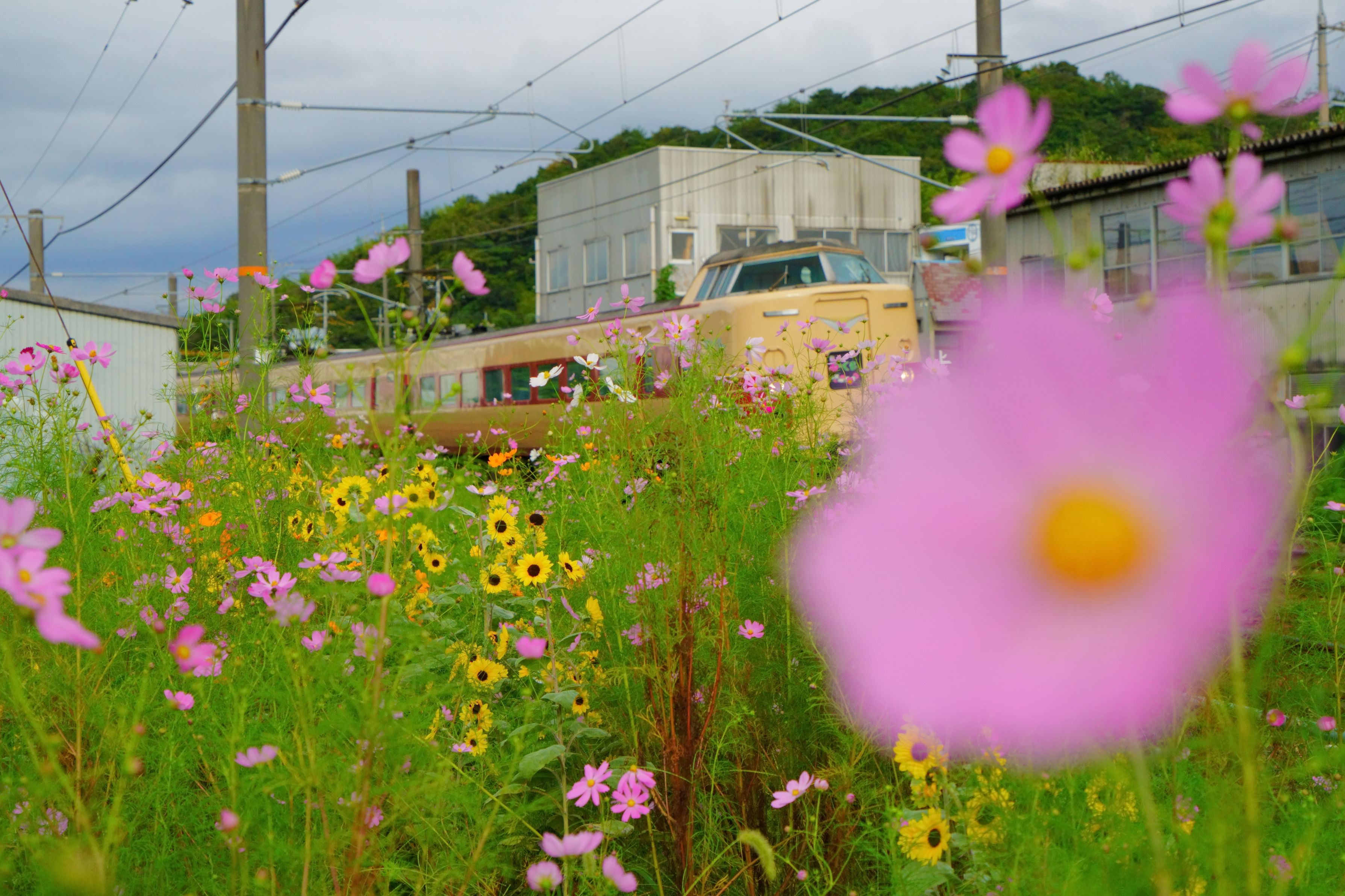 まんま秋桜と国鉄色やくもの写真です。