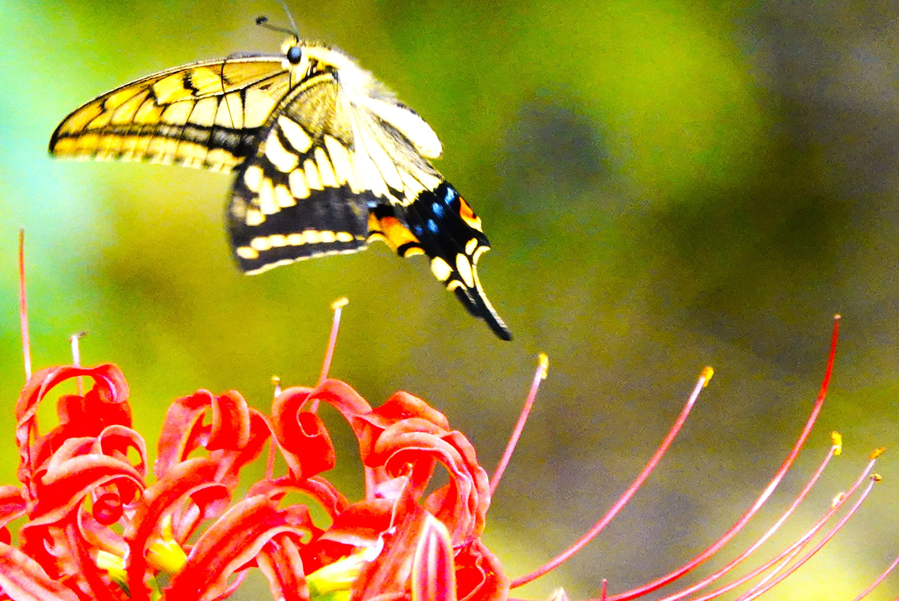 彼岸花が奇麗に咲いているところにアゲハチョウがやって来て蜜を吸っているところが奇麗で撮って見ました。