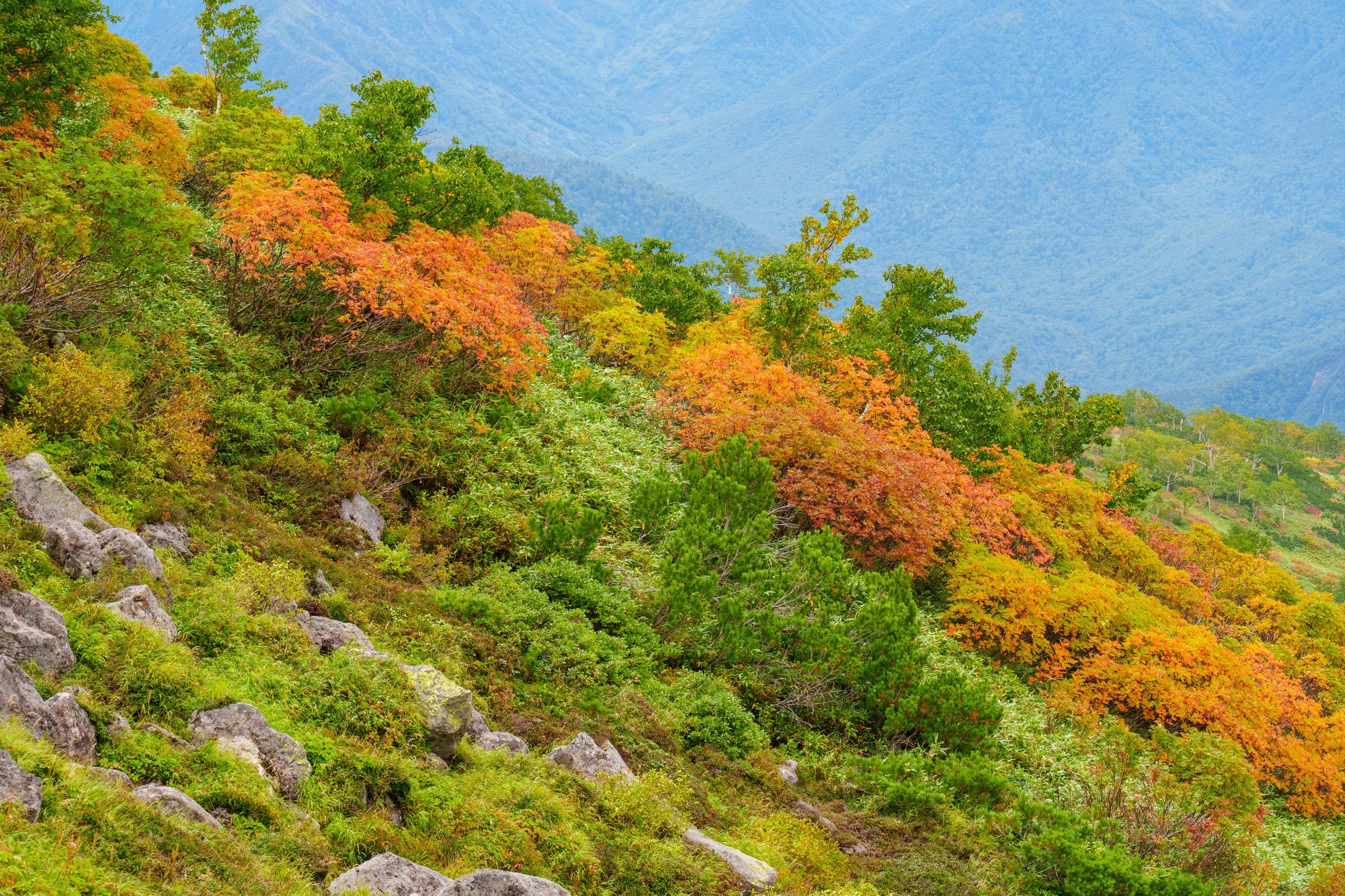 午前中の黒岳に続き、午後は赤岳の銀泉台から第一花園までトレッキング。なかなかきつい登山道でしたが、それなりの紅葉を楽しむことができました。