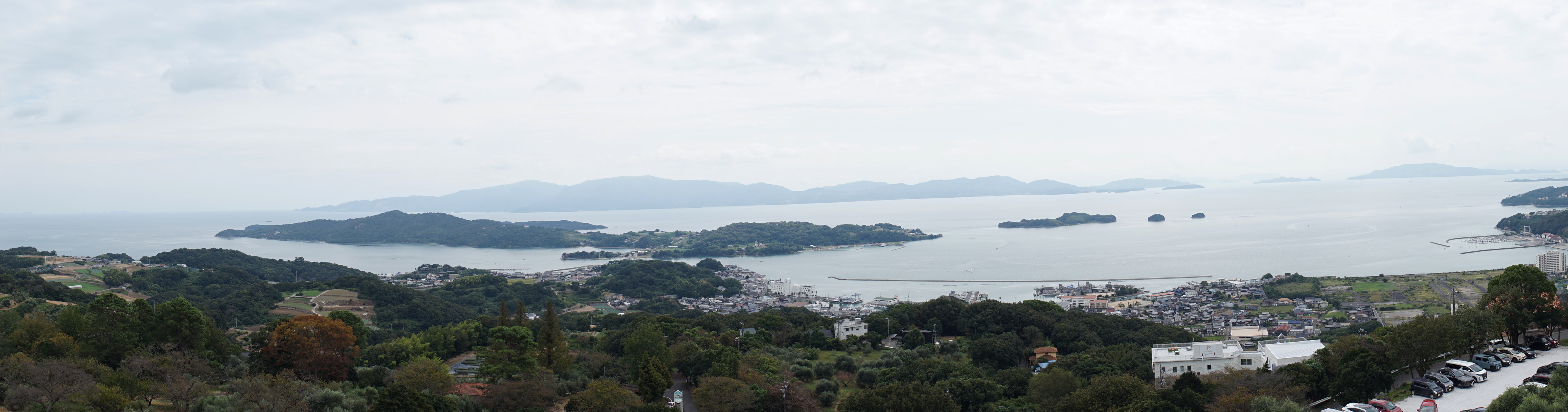 令和5年10月1日、オリーブ園の展望台から見た牛窓の景色です。 中央、海に一文字に見えるのが、元禄8年(1695年)津田永忠の元、わずか10ヶ月で完成させたという、一文字波止です。 中央の大きな島は、前島です。 奥にうっすら写っているのは、小豆島のようです。 この牛窓には、江戸時代朝鮮通信使も立ち寄りました。