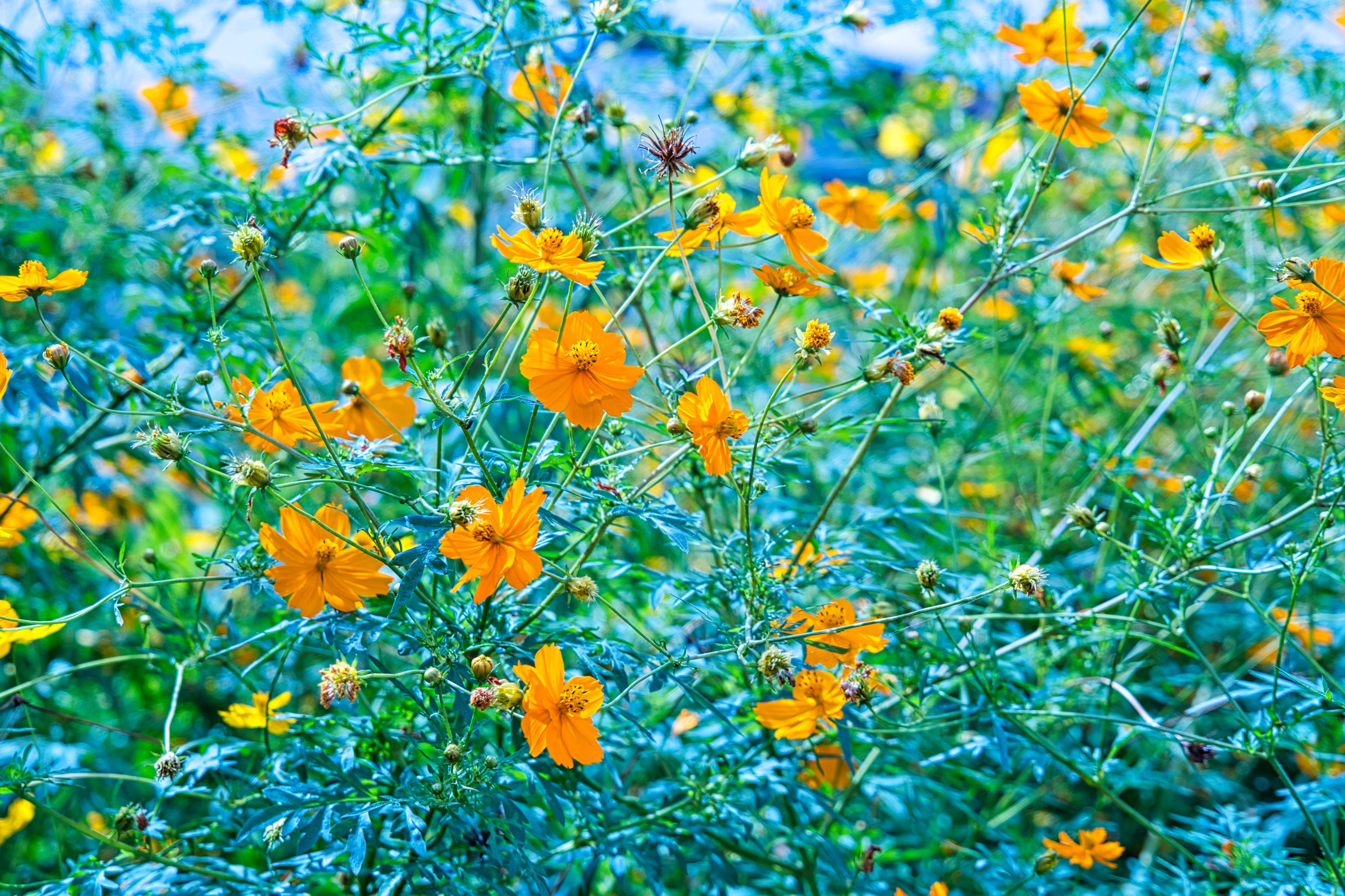 何気ない普通に咲いている街中のキバナコスモス風景 ごちゃごちゃ背景をストロボ・カラーシフト背景処理、 ストロボ光が当たらない背景をブルーに染めて印象的に表現しました。 ストロボ設定:オレンジフィルター+WB3000K