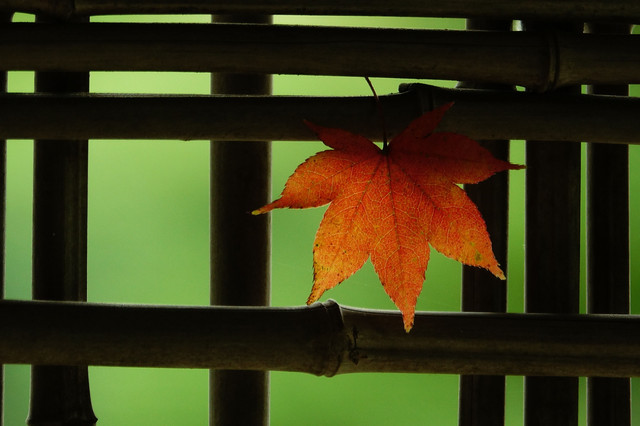 日本庭園の東屋にある竹格子には色づいた楓の一葉が秋の訪れを感じさせてくれました。