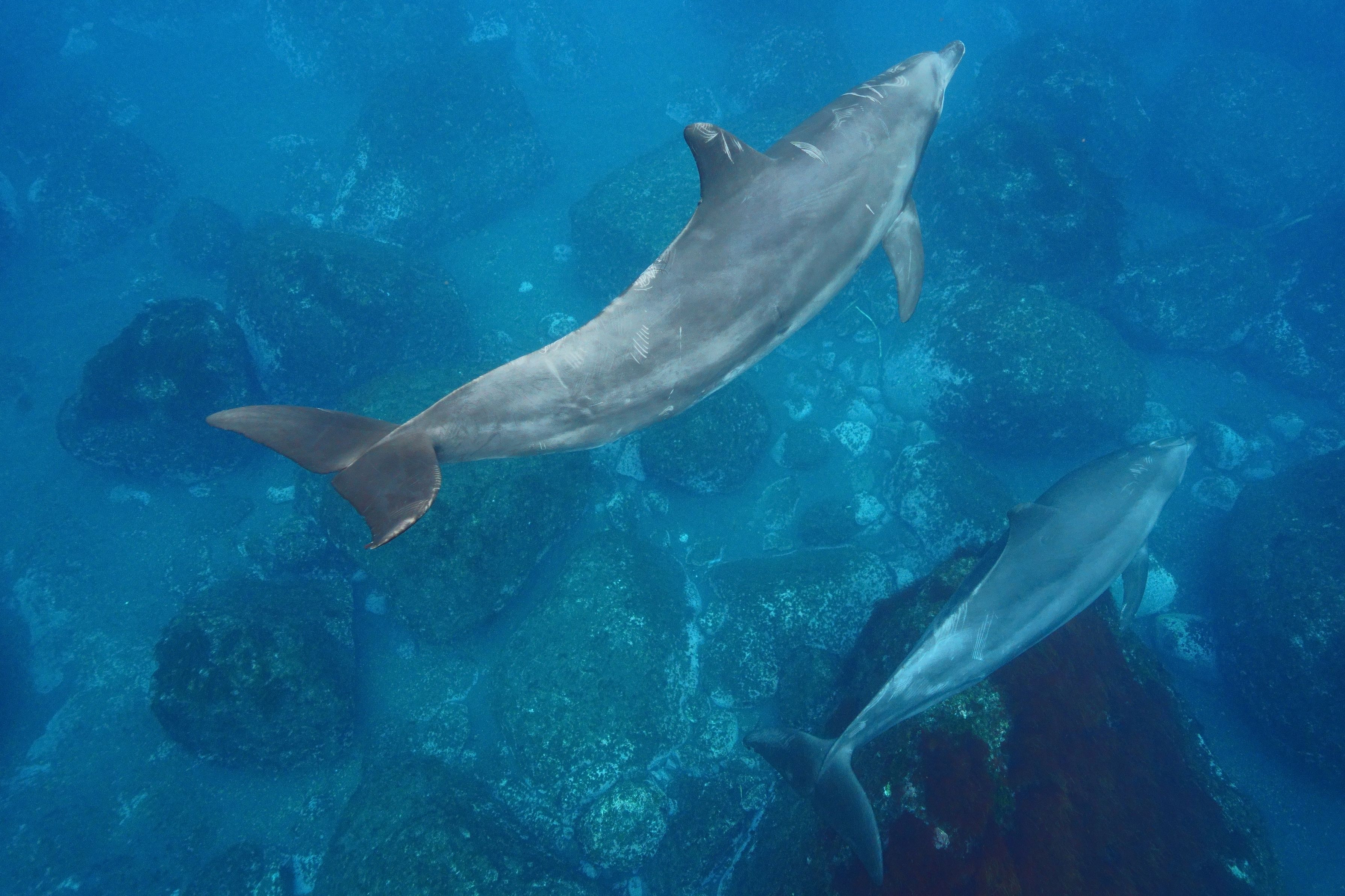 海にエントリーした時にはすでに目の前に迫っていたイルカたち。潜る間もなく水面から後姿を見送りました。