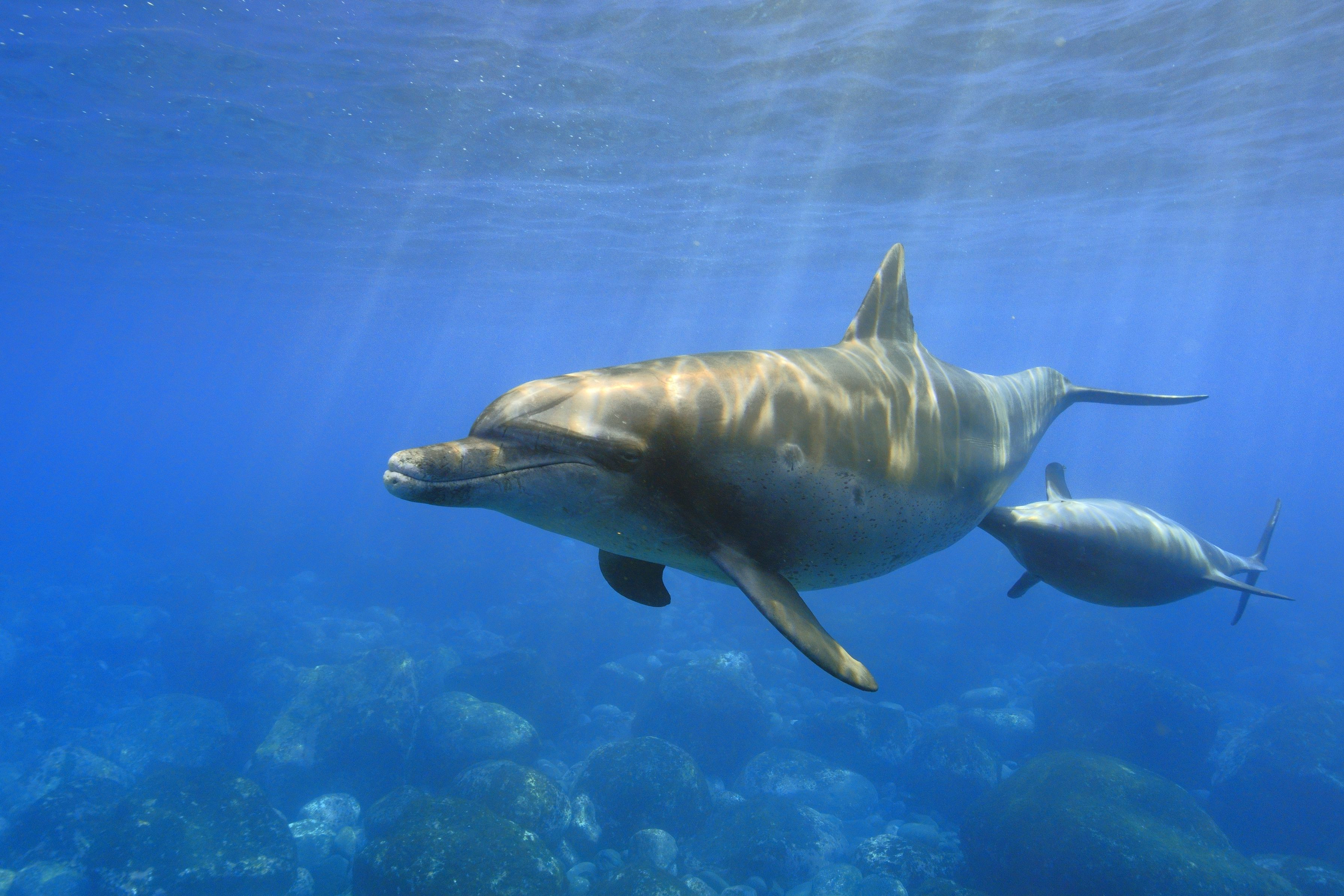 柔らかな日差しの中、イルカ2頭が近づいてきてくれました。口先でお母さんのおなかをつついて食事をおねだりしている子供と、尾びれを止めてそれにこたえるお母さん。貴重な場面に出会うことができました。