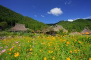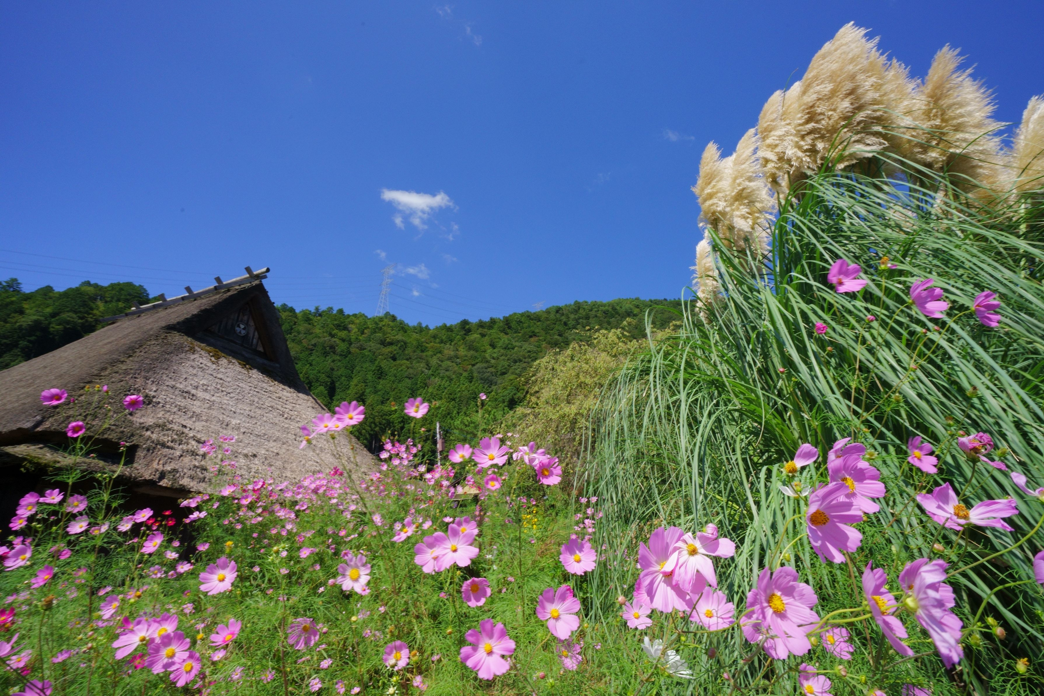 かやぶきの里にコスモスが彩を添えていました。