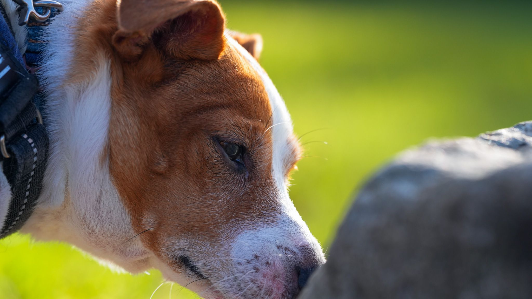 暖かい日差しを浴びながら石の匂い嗅いで情報収集してます🐶穏やかな目で嗅いでる姿です。