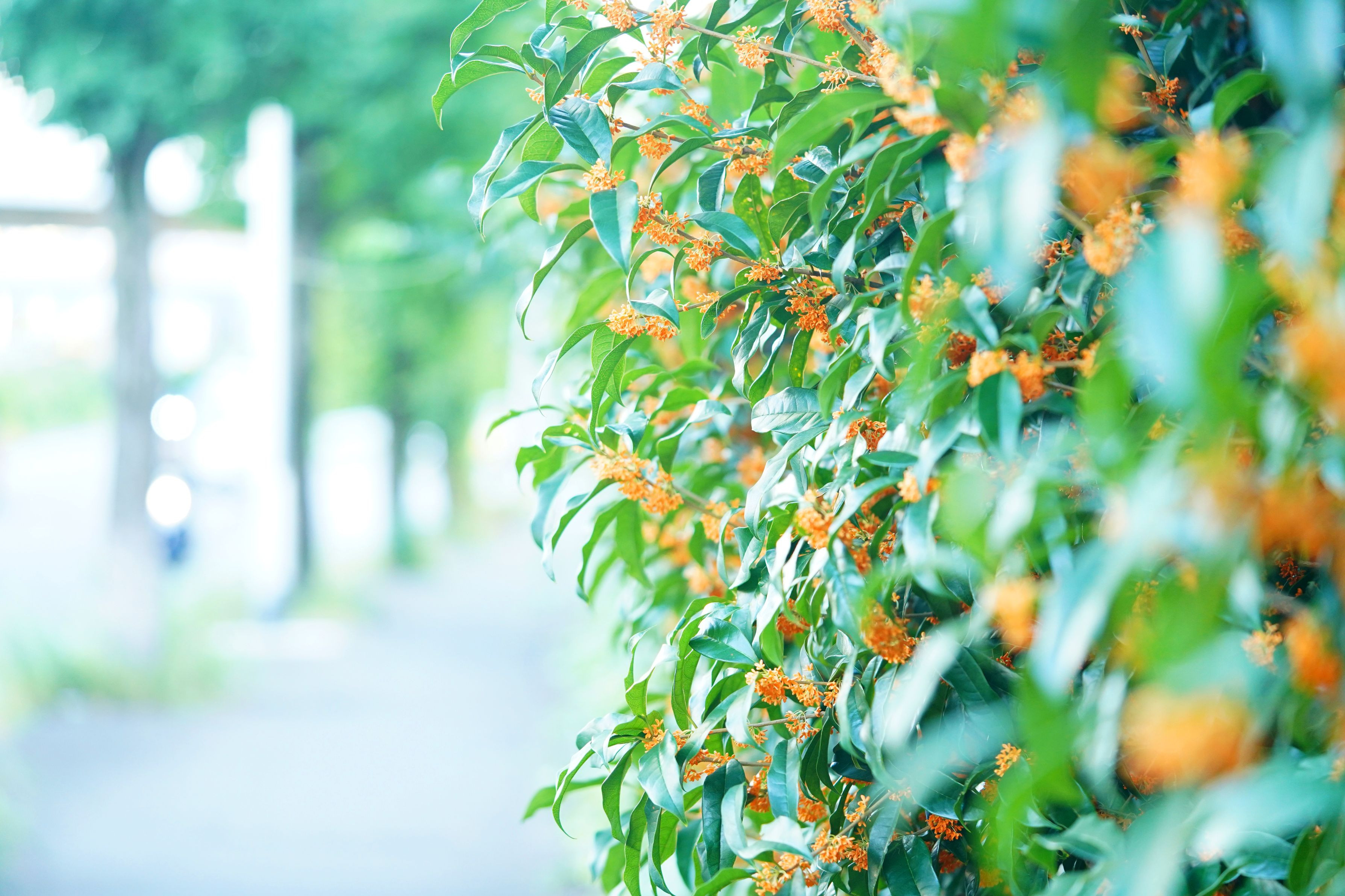 キンモクセイの生垣が続く散歩道、早朝に歩いていると ほんのりと芳香が漂い秋の訪れを告げてくれる。