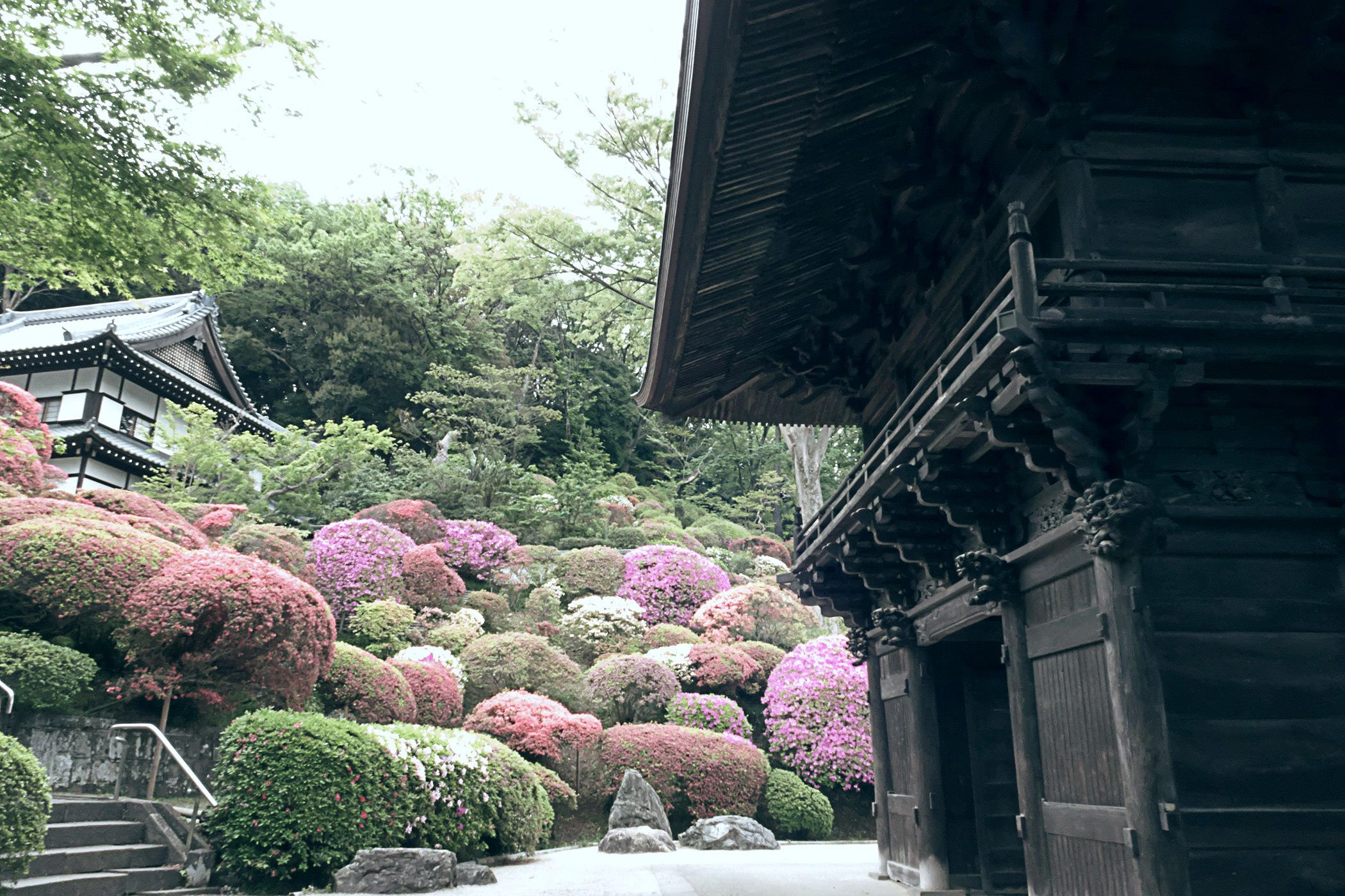 川崎のつつじ寺。 等覚寺の巨大な山門と斜面のつつじ。