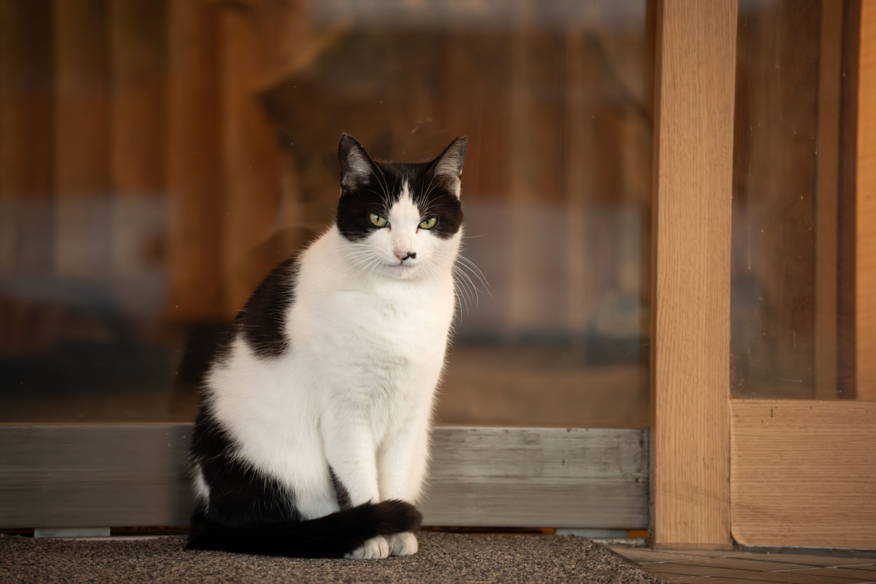 玄関の前で、じっとお客様を待っているかのような旅館の愛され猫さん。
