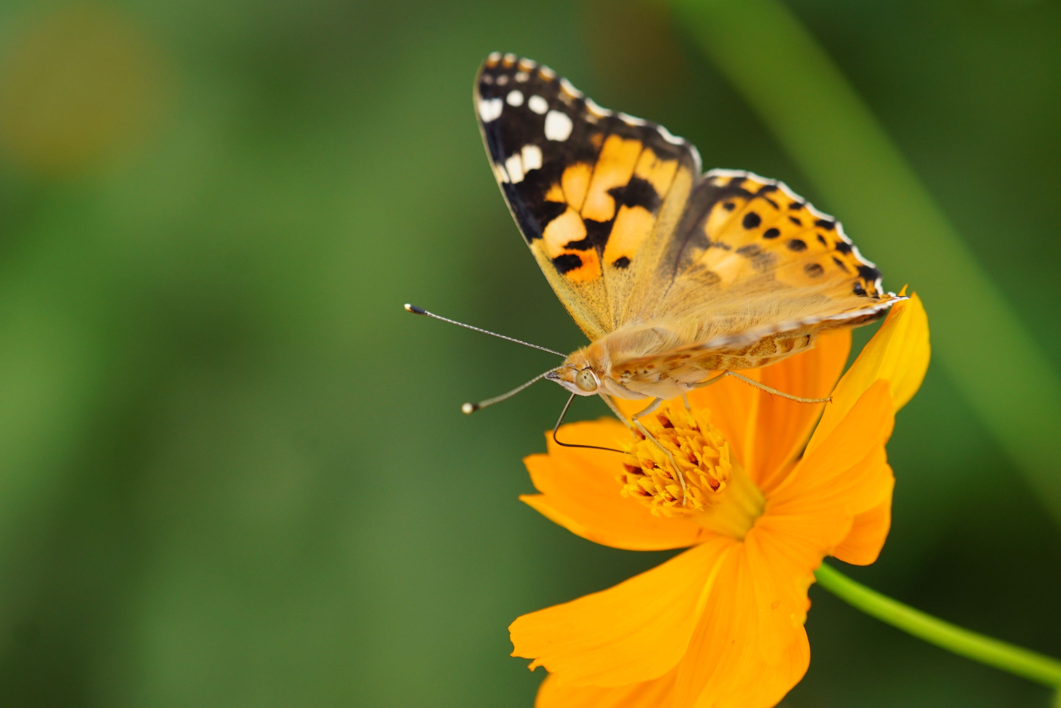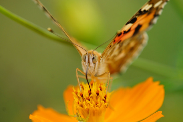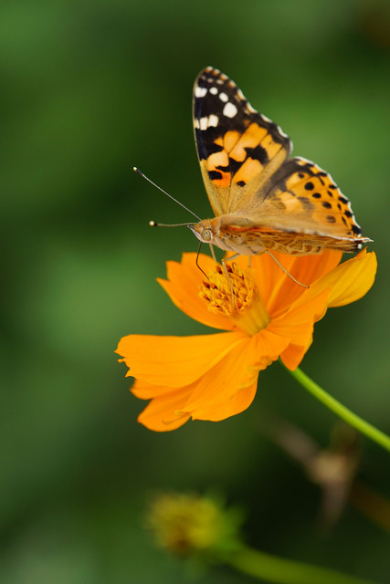 よそ様のキバナコスモスにやってきたヒメアカタテハ。