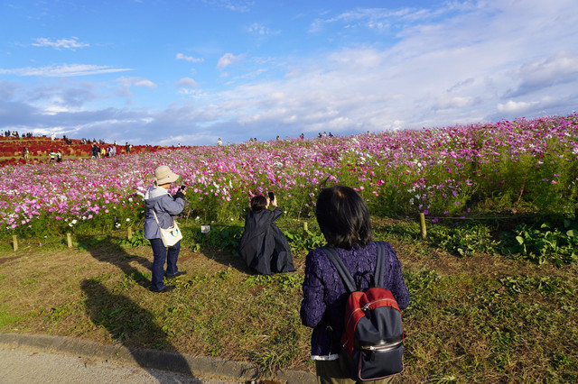 旧友たちとひたち海浜公園へコキアを見に行きました。コキアの前に広がる秋桜畑をうまく撮るために試行錯誤の3人です。