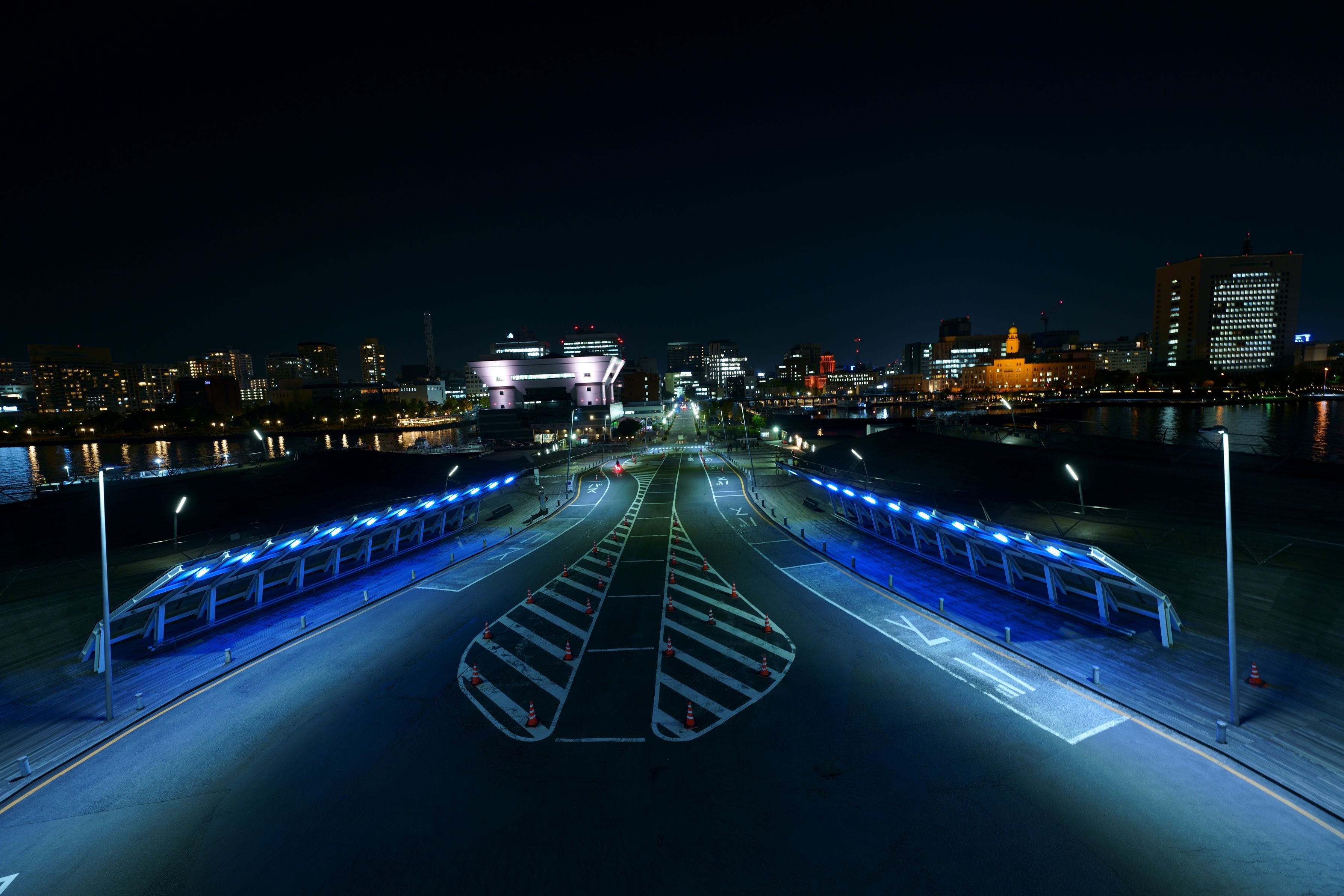 横浜港大さん橋国際ターミナル屋上からの眺め。まだ深夜でもないのに人の往来が無くバイクの音が聞こえなくなると静まり返りました。