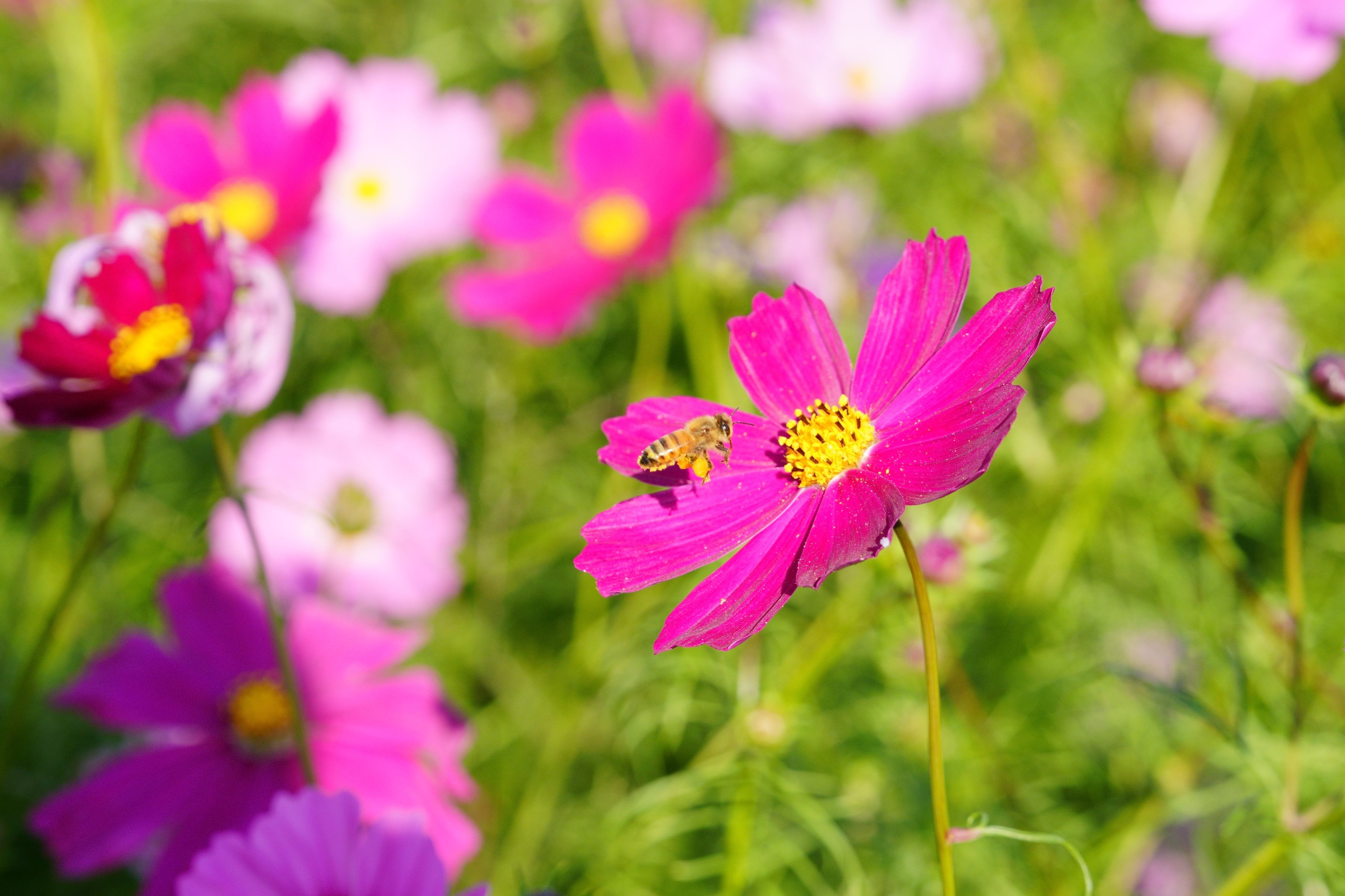 秋の満開コスモス ミツバチ花粉だんご