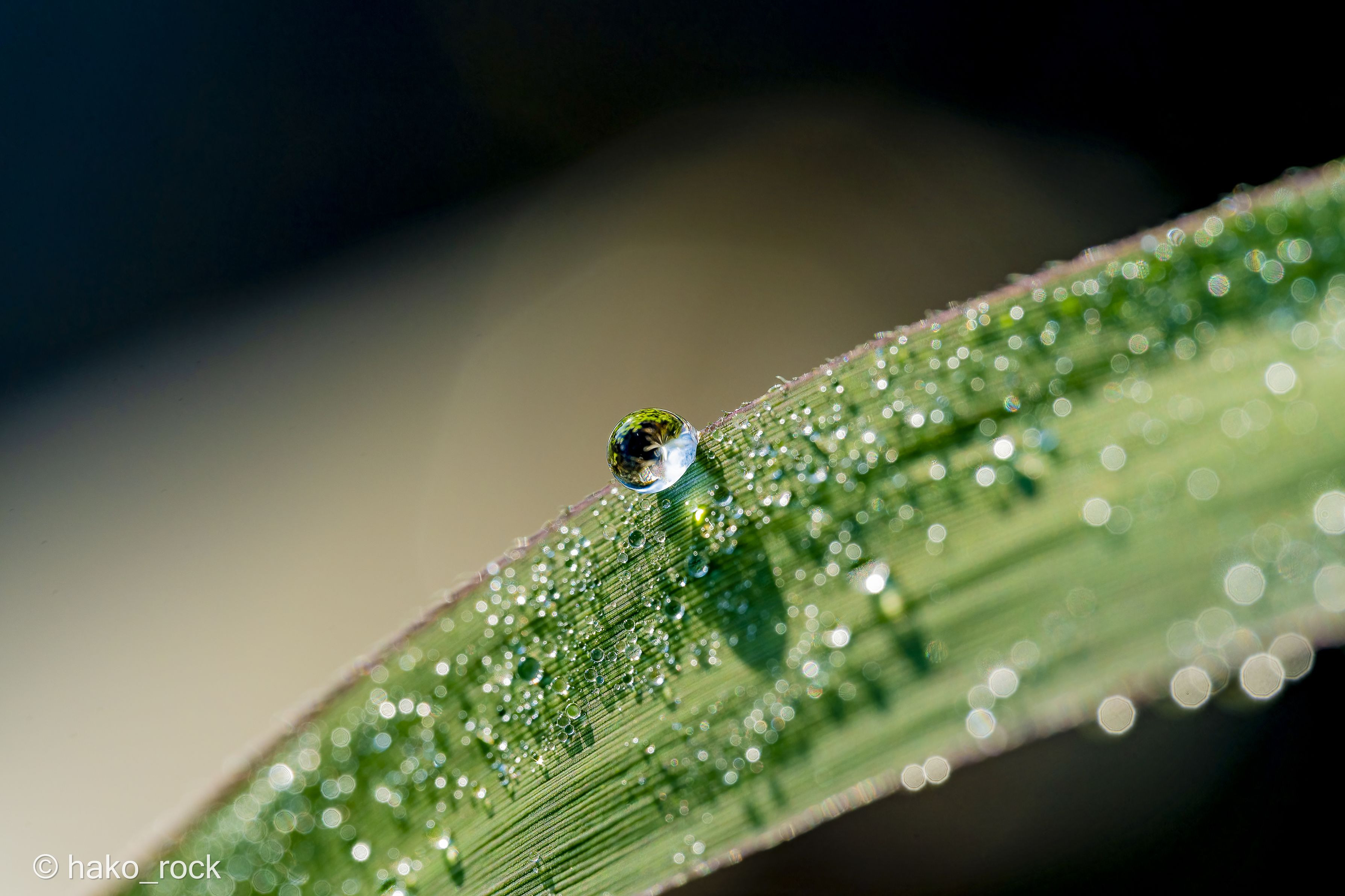 雨上がり、葉の上の水滴のなかにはまた別の世界がありました。