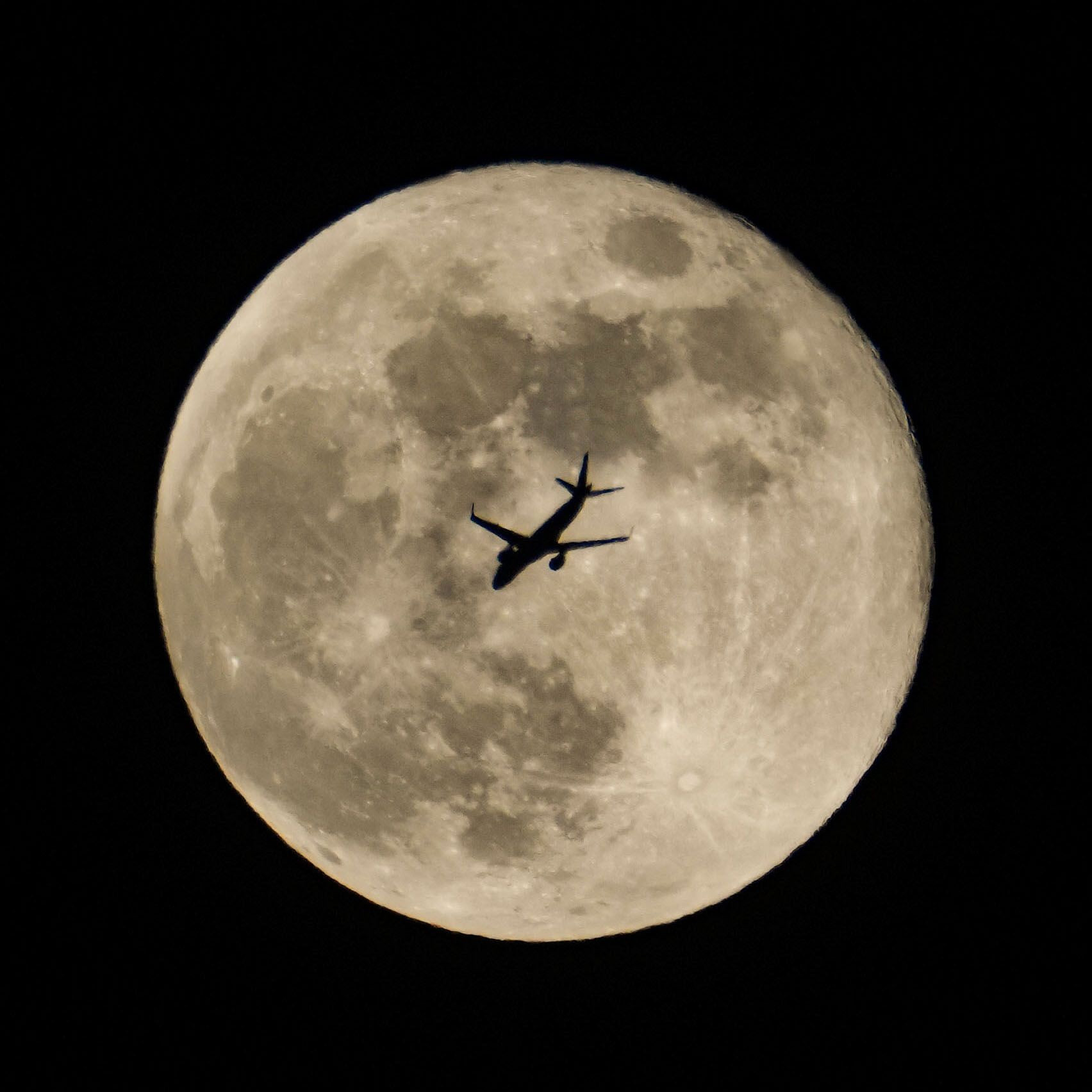 自宅上空を通過する飛行機と満月のコラボ