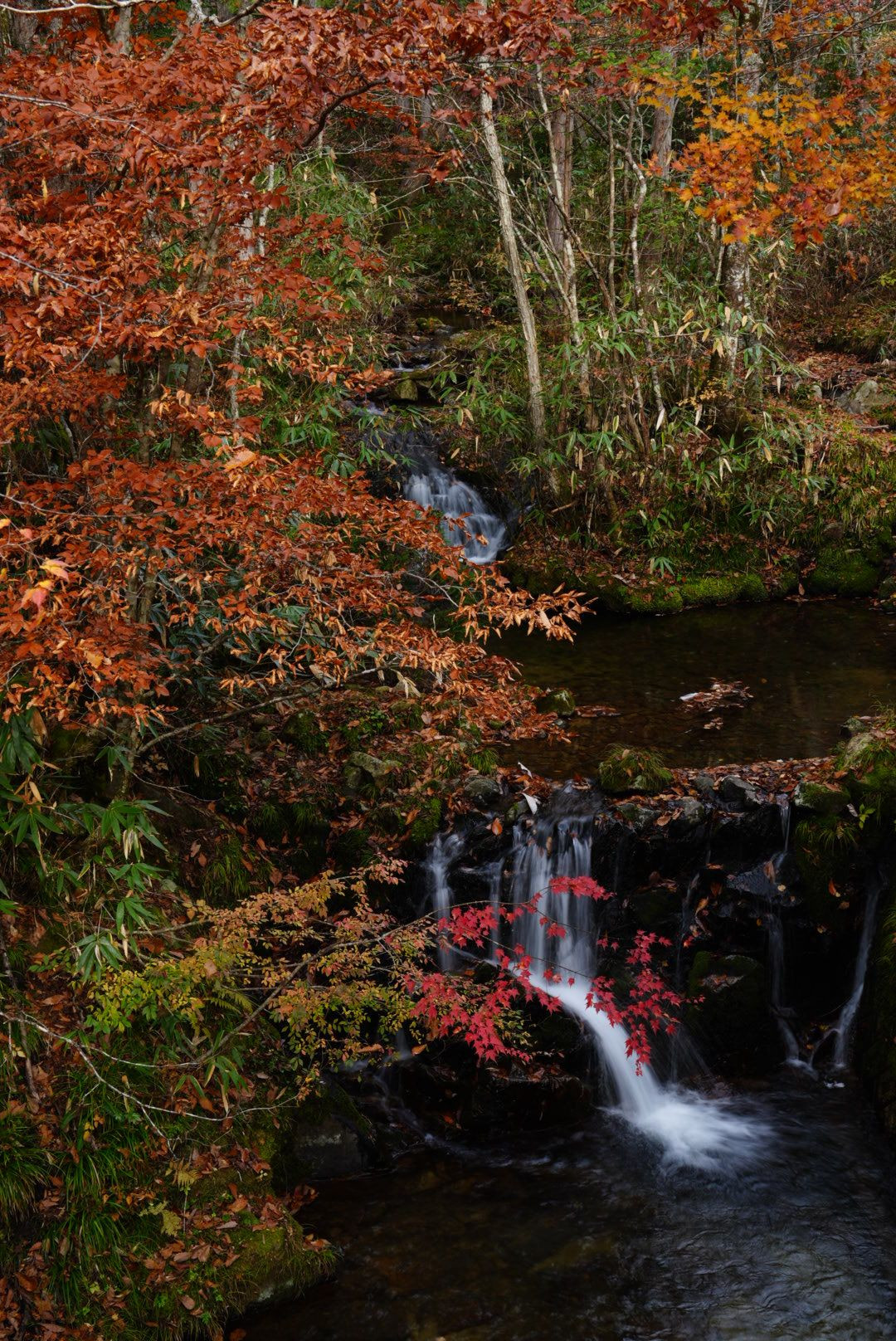 最近は、熊が怖くて森の散策も少し怖い。😅 でも、少しふらふらして見つけた小さな水の流れ。。 滝とは言えないけど、赤い紅葉が綺麗に見えた🎶