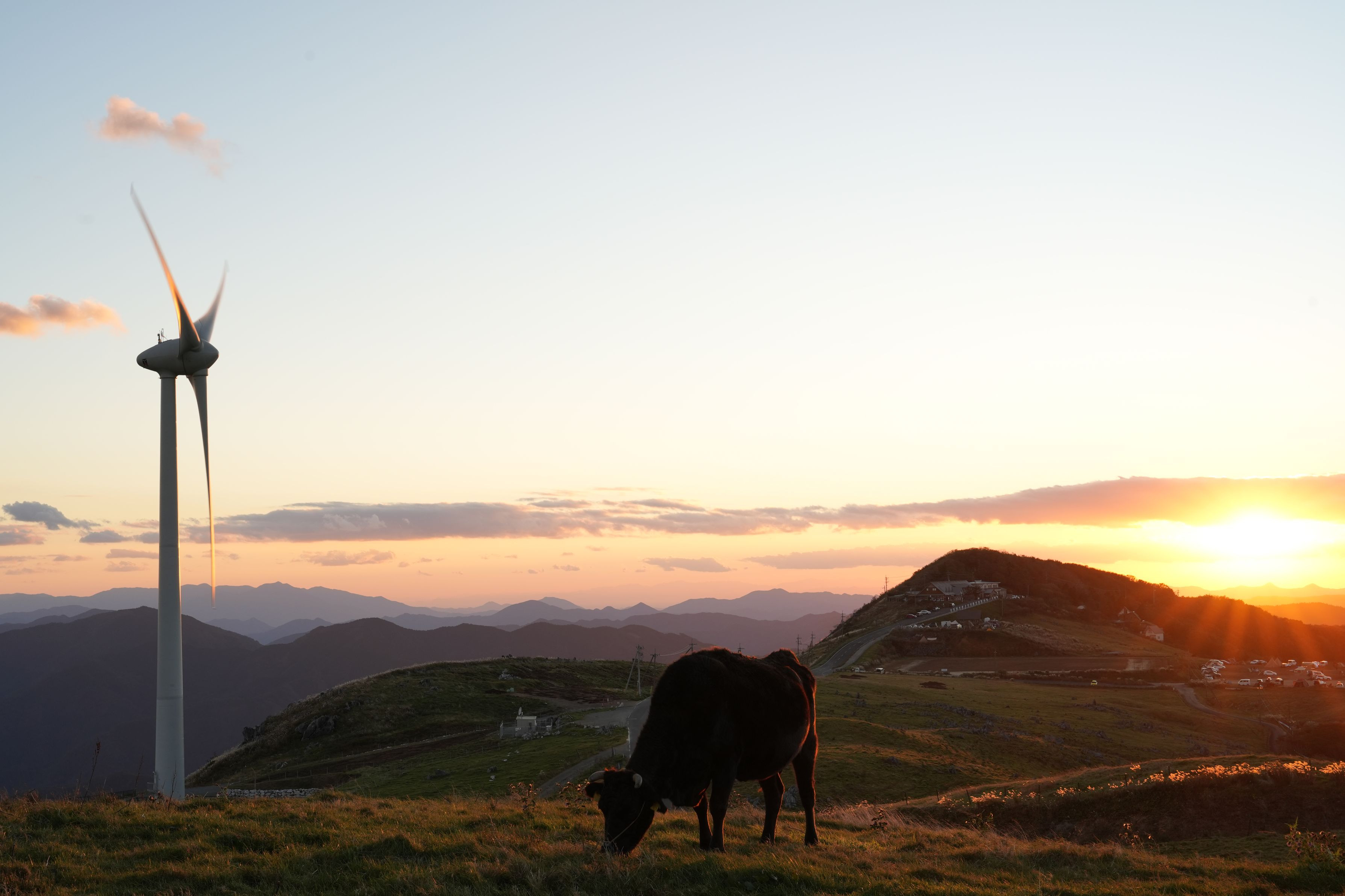 四国カルストにて夕暮れ時に撮影 この地に住む牛の日常を、広大な自然と人工物の風車を交え撮影しました。 人工物と自然の美しさが引き立て合うように意識して撮影しました。 カメラ📷をしっかりやり始めて初の投稿です。 何かアドバイスをいただけると嬉しいです。