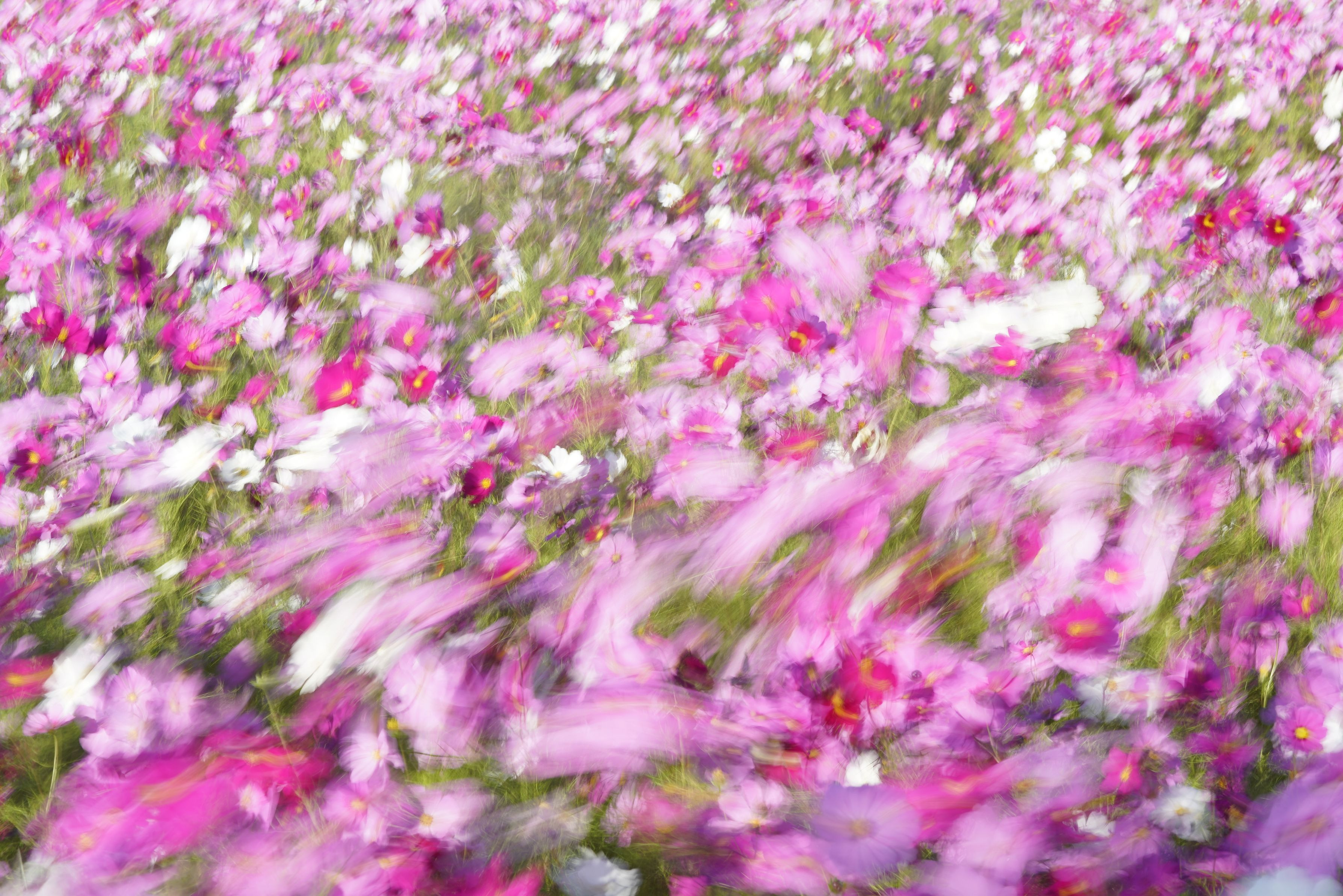 ゆれるコスモス、スローシャッターで