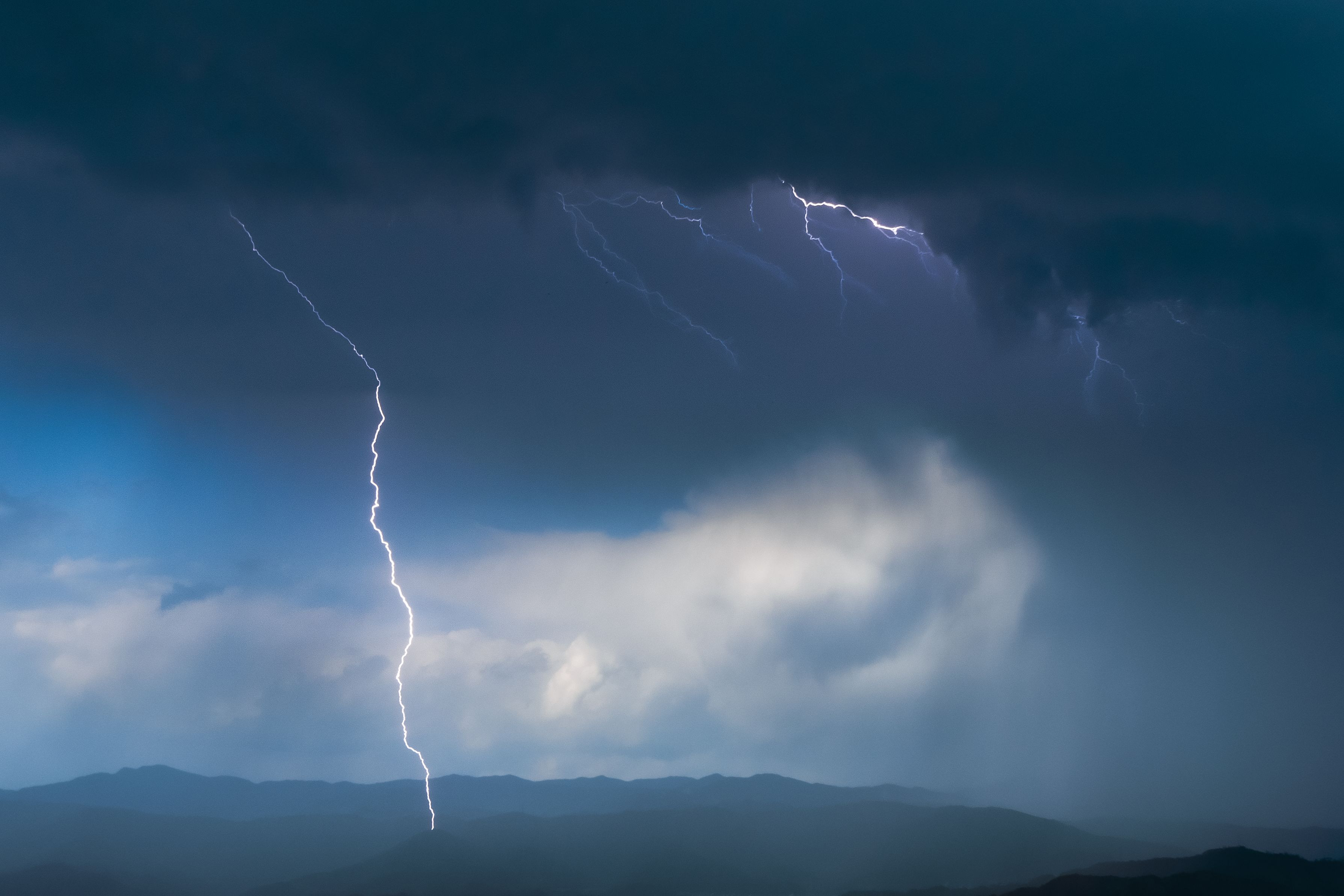 高知市にある牧野植物園に行こうとして、ふと、五台山山頂付近に足を伸ばしました。 駐車場で車を降りて、遠くの山々を見ていると、それまで晴れていた空が急に黒雲に覆われ、稲光が走りました。 思わず電子シャッターで連写をしていると、なんとか撮れていました。 尚、手持ちで撮りましたが、比較明合成で左右の雷を入れています。