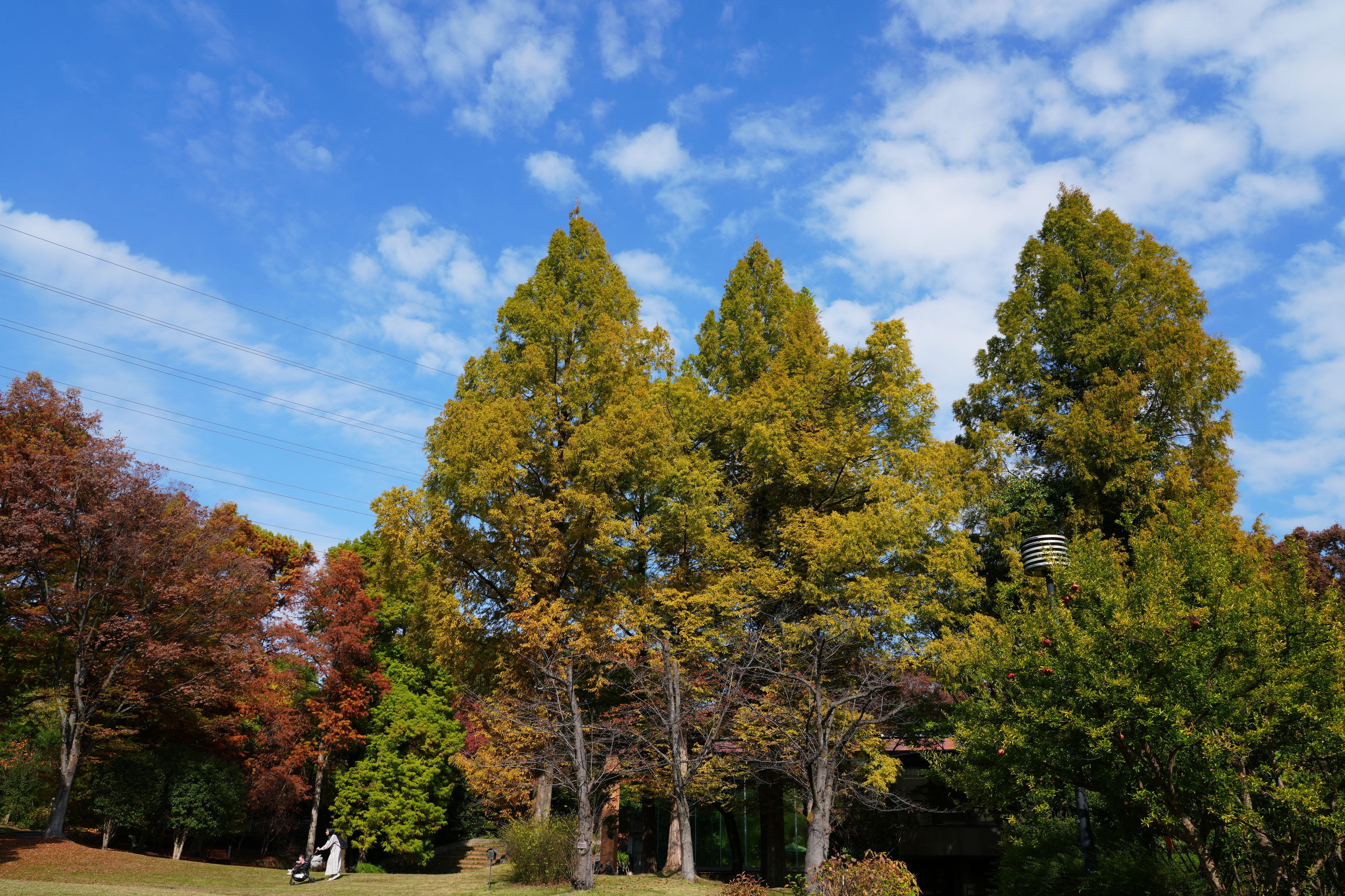 晴天の植物園、紅葉が始まった木々の間をベビーカーを押したお母さん。子供と、どんな話をしてるんでしょうか?