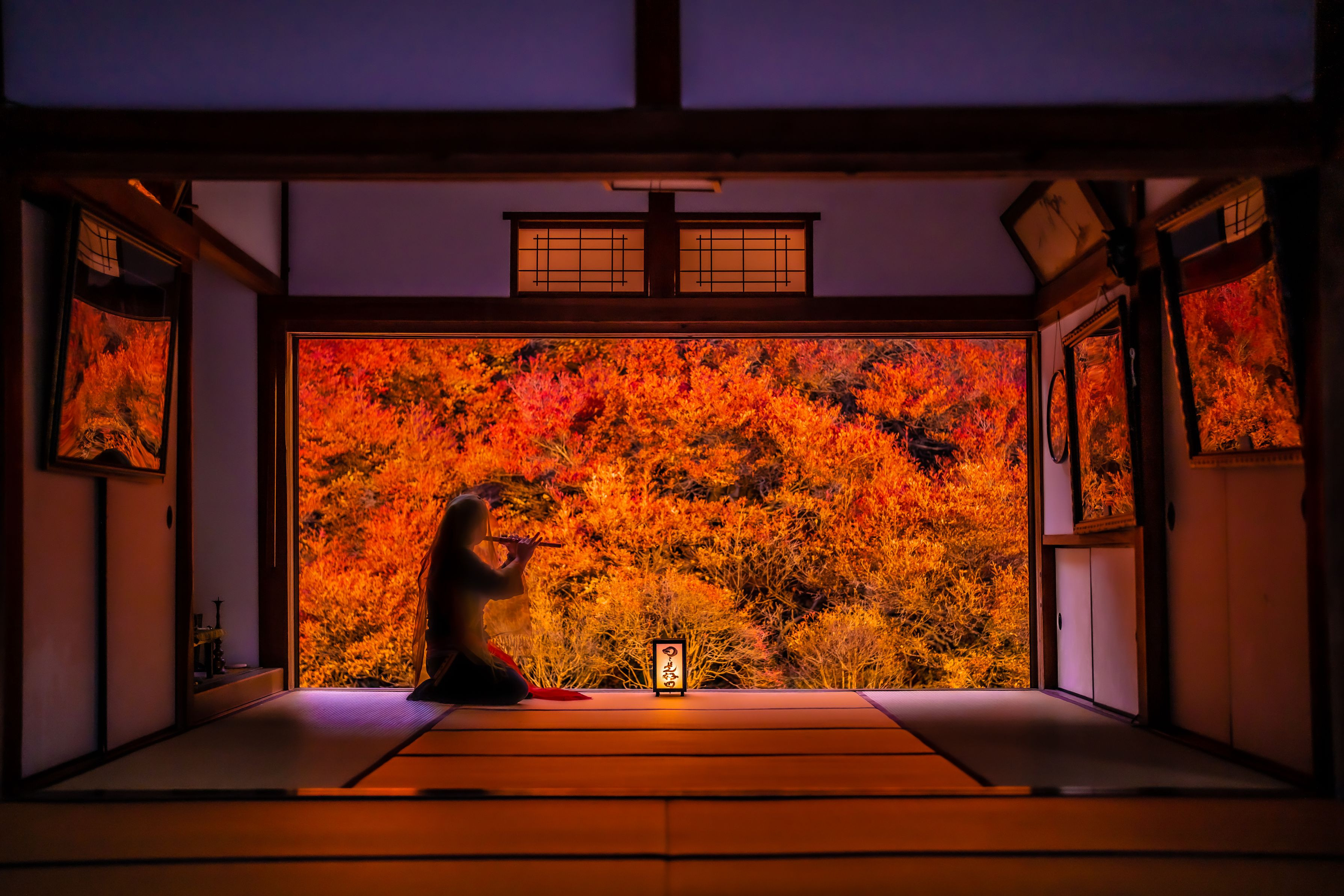 朱色に色ずくドウダンツツジが見事な但馬安國禅寺にて奉納の篠笛を奏でるお姿を撮影しました。