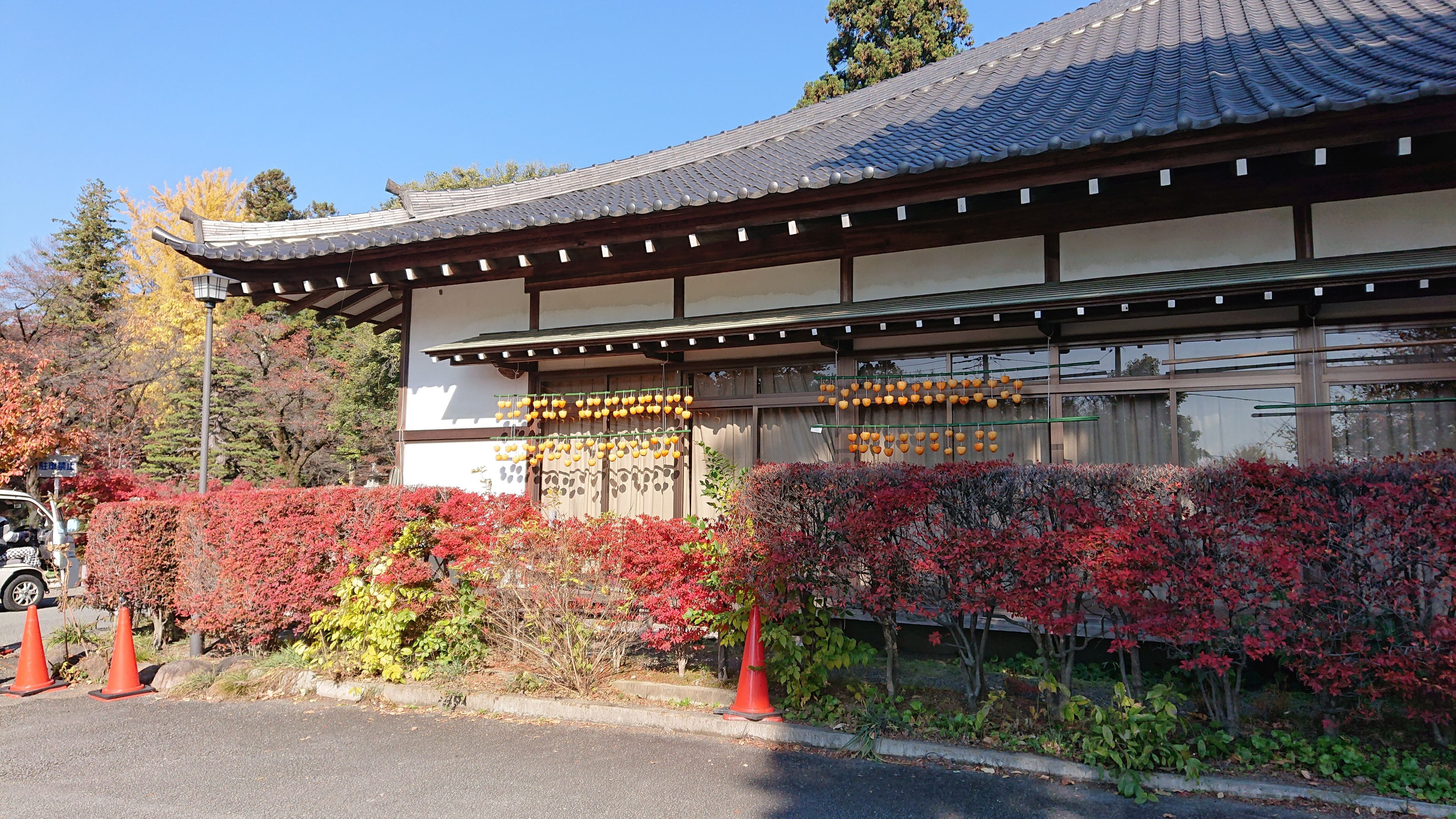寺の境内から横手に入ると、宿坊の裏に毎年見られる吊るし柿! 日がよく当たるので甘くて美味しい干し柿になるそうな!!