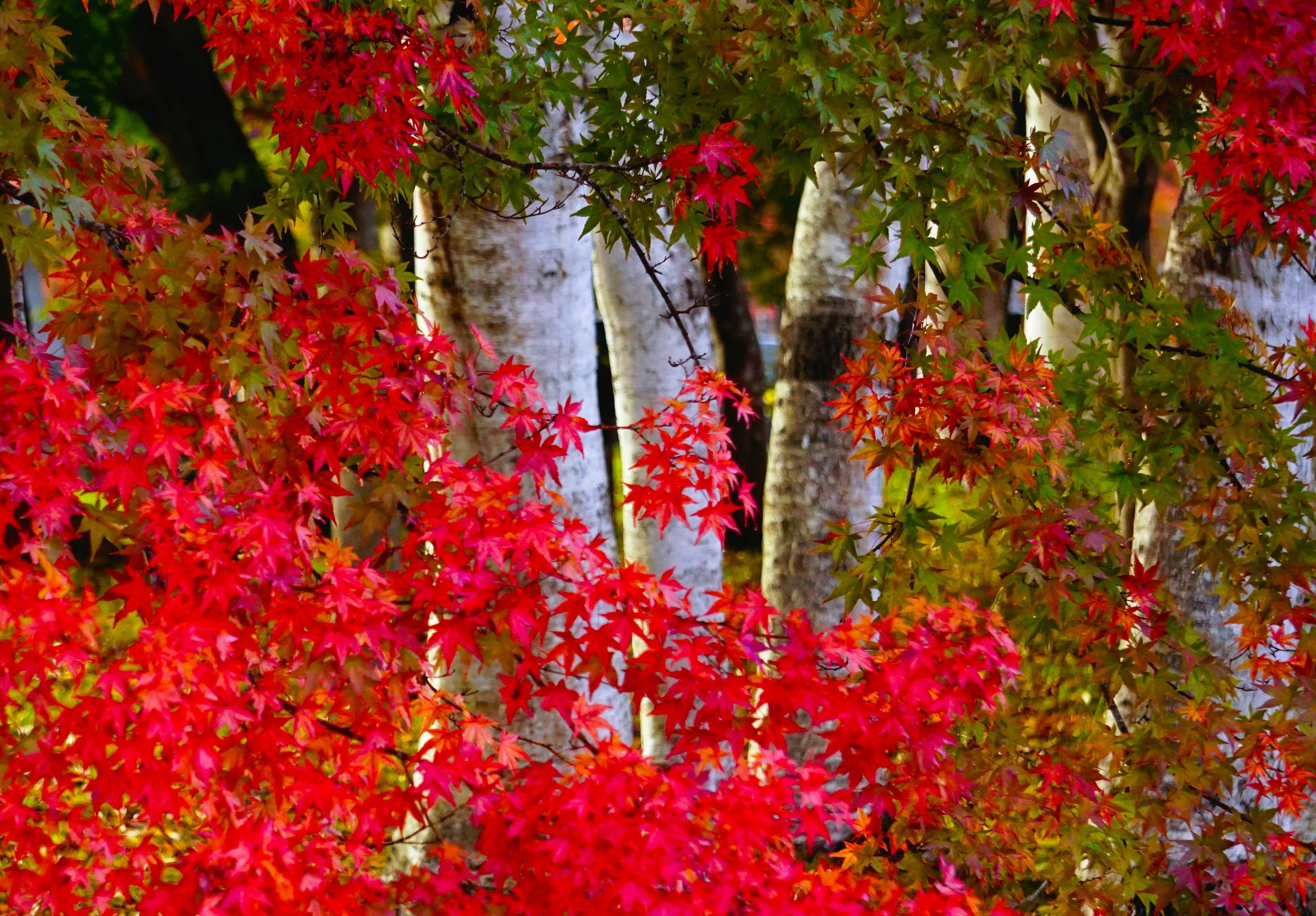 白樺に赤いモミジが綺麗でした。順光で撮影。