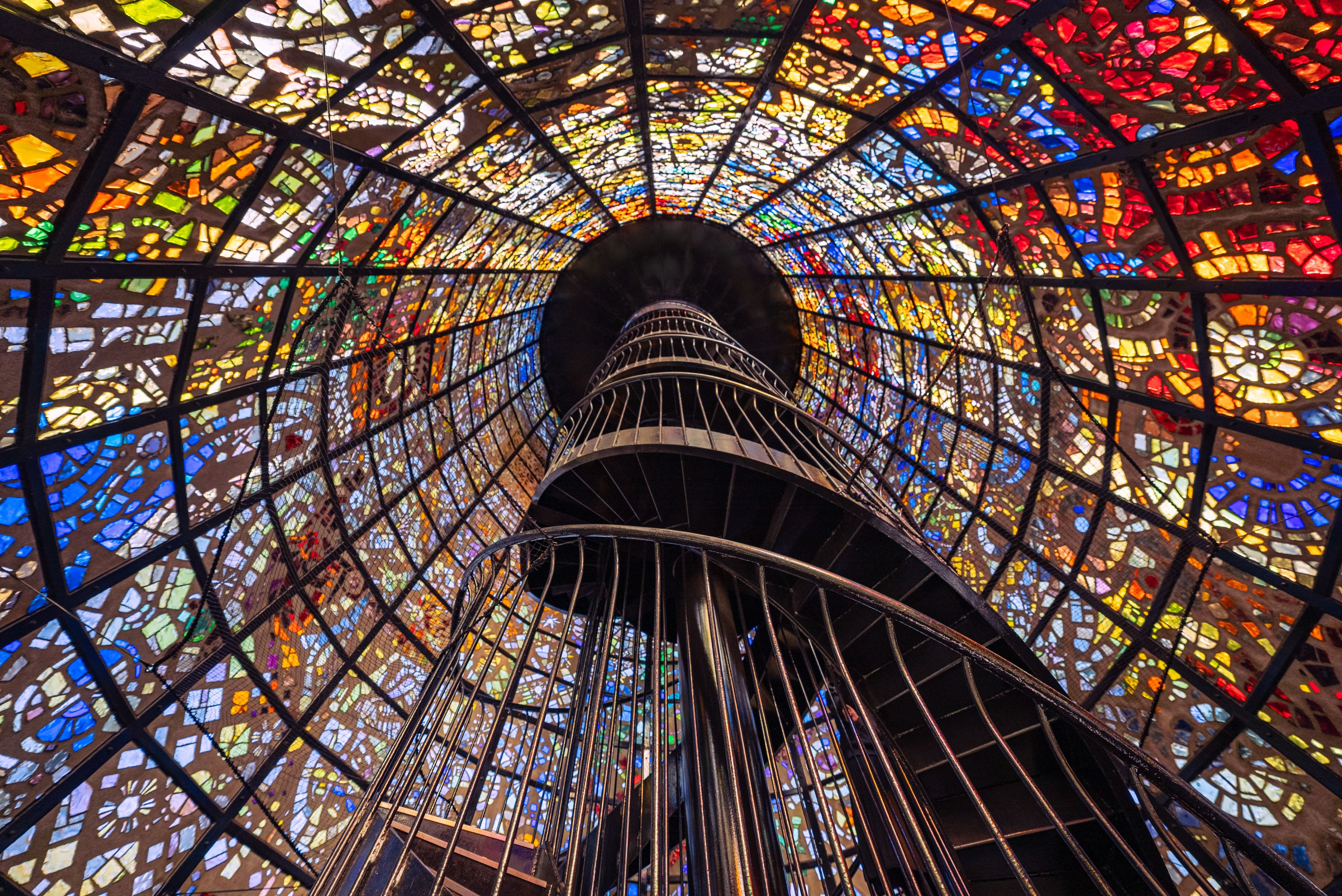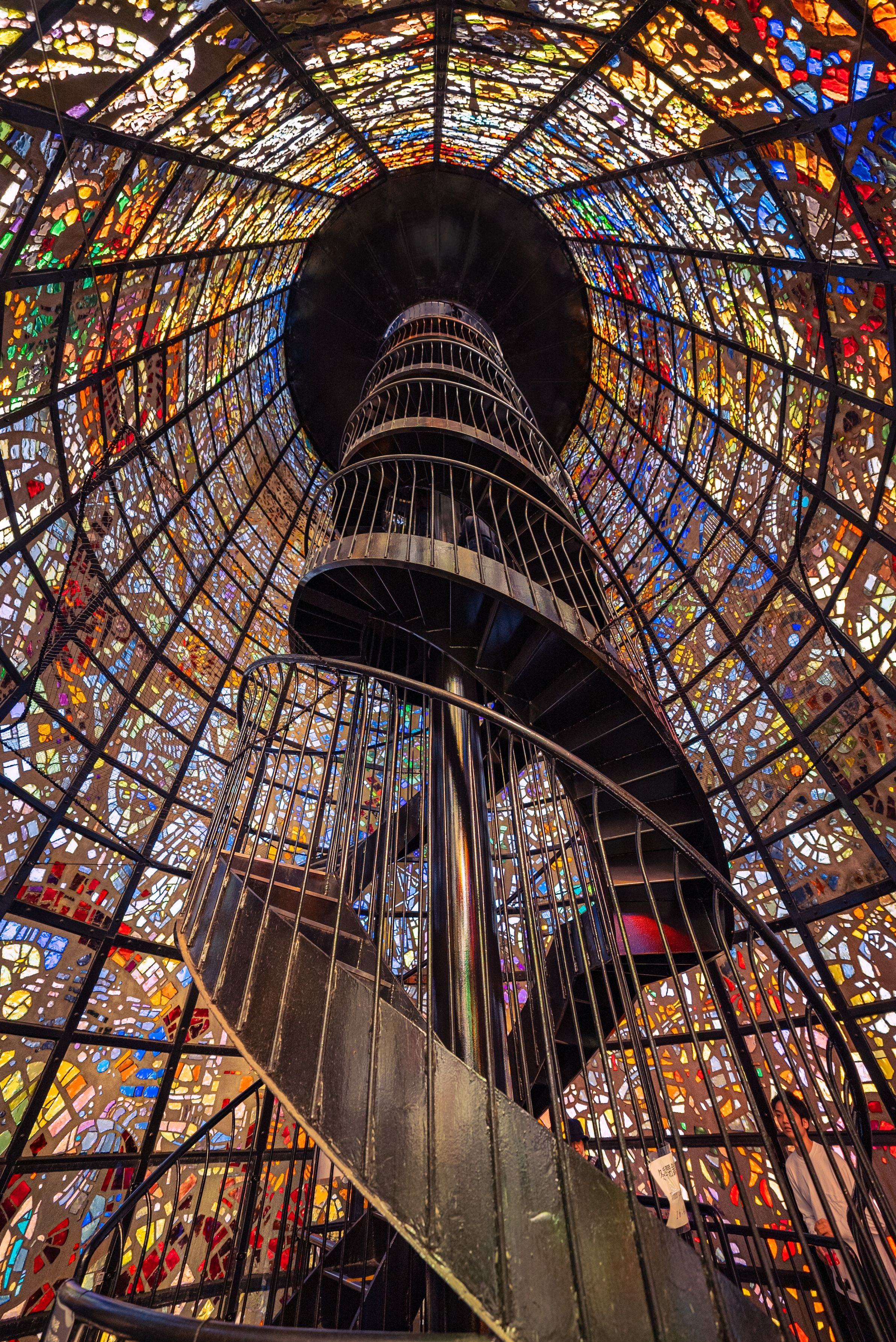 最近、螺旋階段を一つのテーマにしていたが、当初から、「彫刻の森」の螺旋階段を撮りたくて仕方なかった。 箱根彫刻の森「幸せをよぶシンフォニー彫刻」である。 ステンドグラスの輝く光に包まれた螺旋階段は、大いに楽しませてくれた。