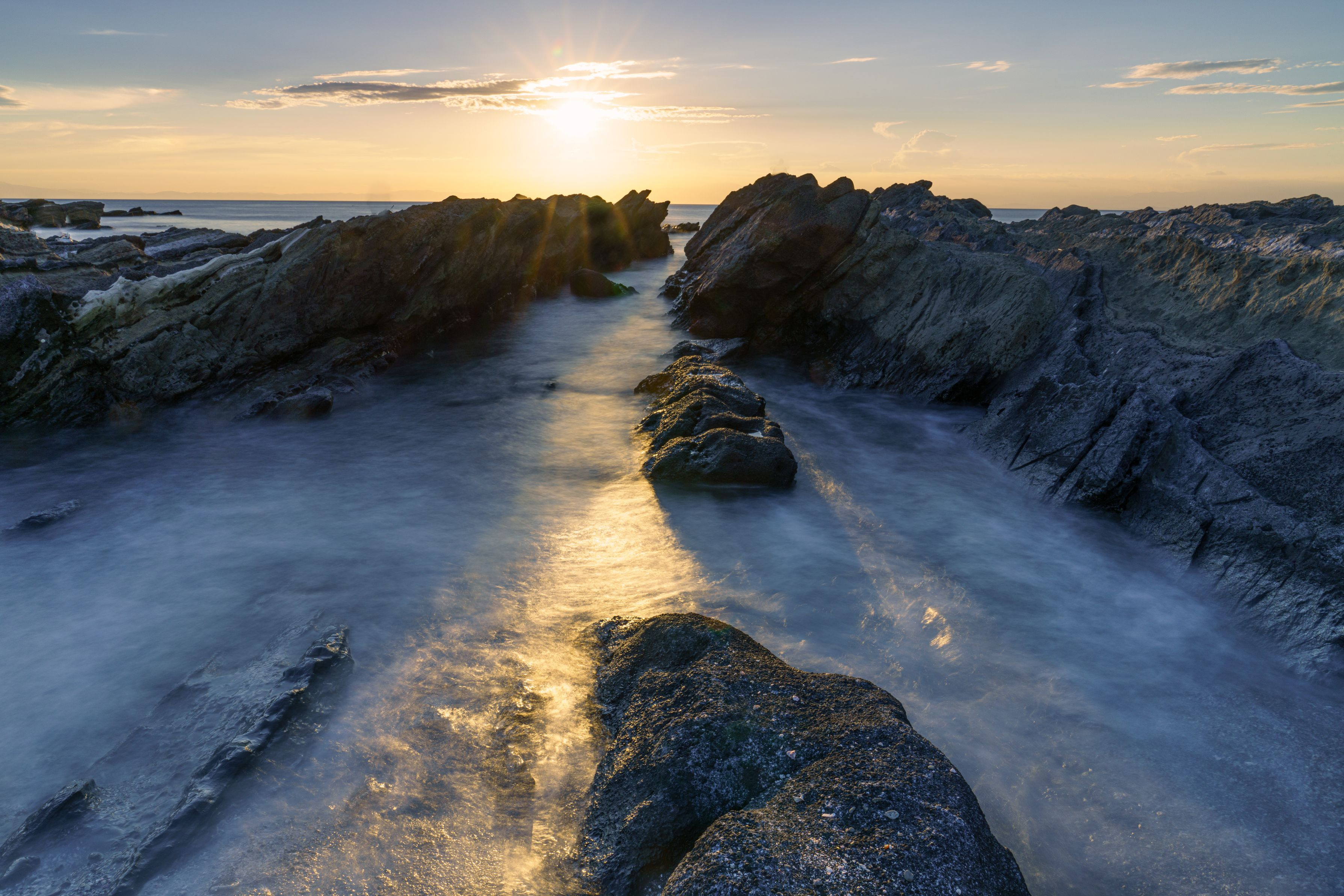 満潮を迎えて波により浸食される岩。広大な時間の流れを感じる。