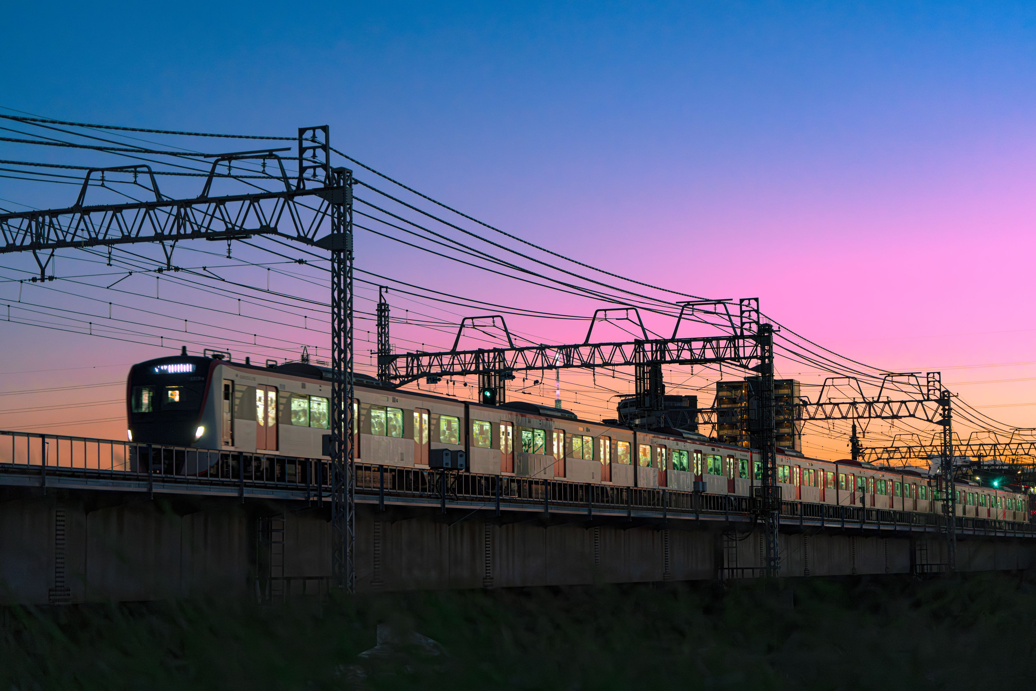 マジックアワーを撮影しようと出かけると、鉄道と組み合わせては?とひらめきました。多くの方がこれからご帰宅のようです。1日お疲れ様でした。 カメラ:α7R V レンズ:FE 70-200mm F2.8 GM OSS II