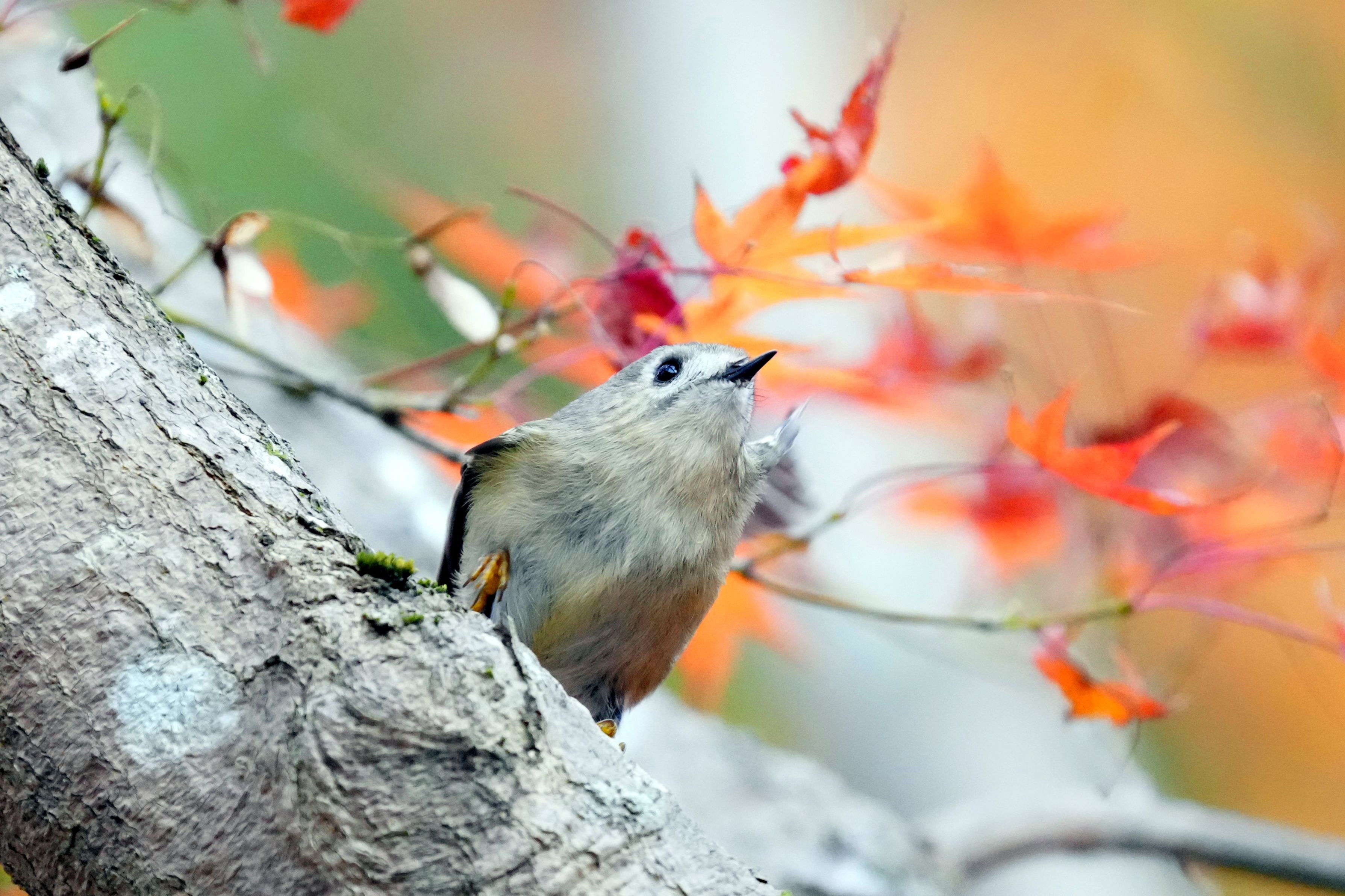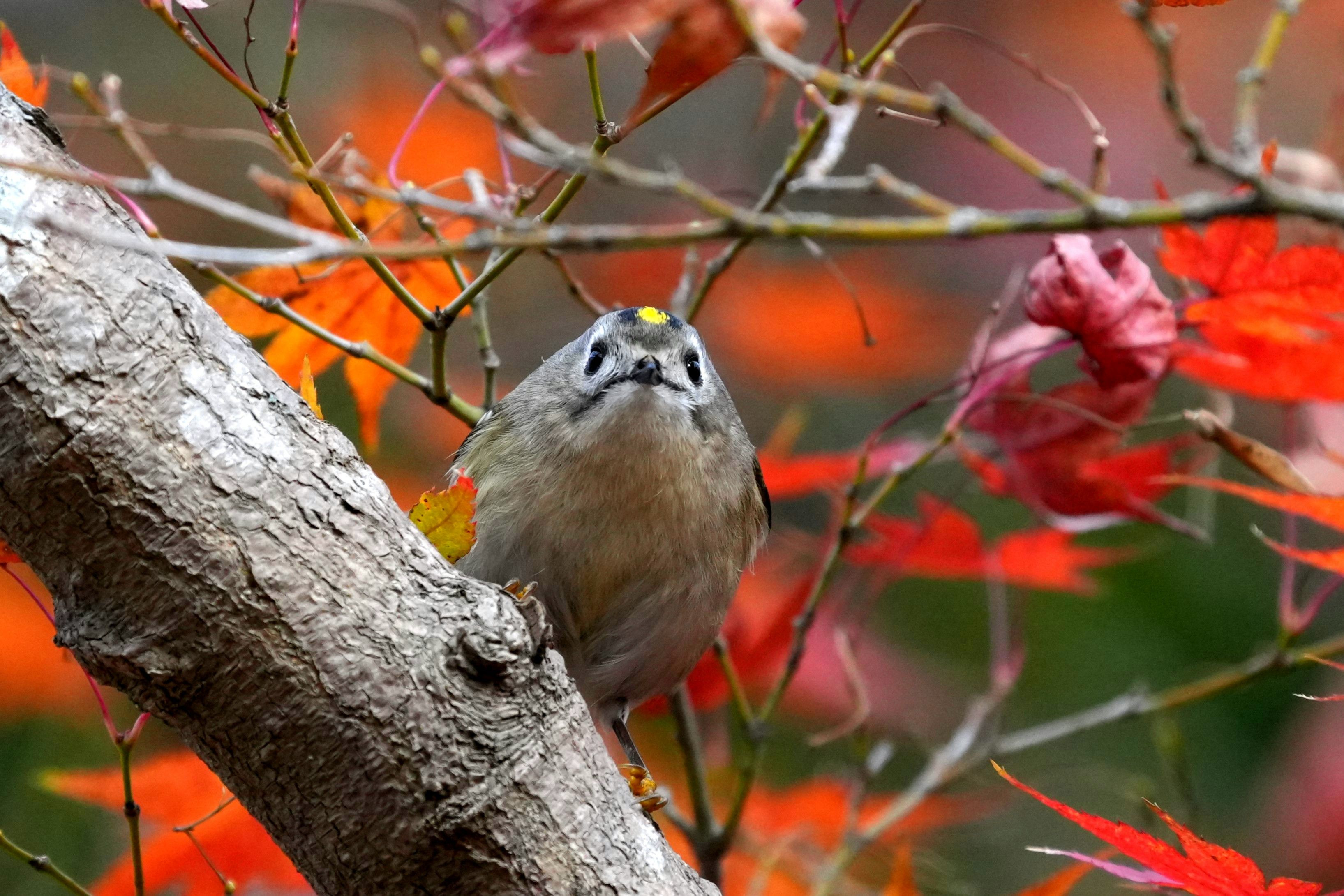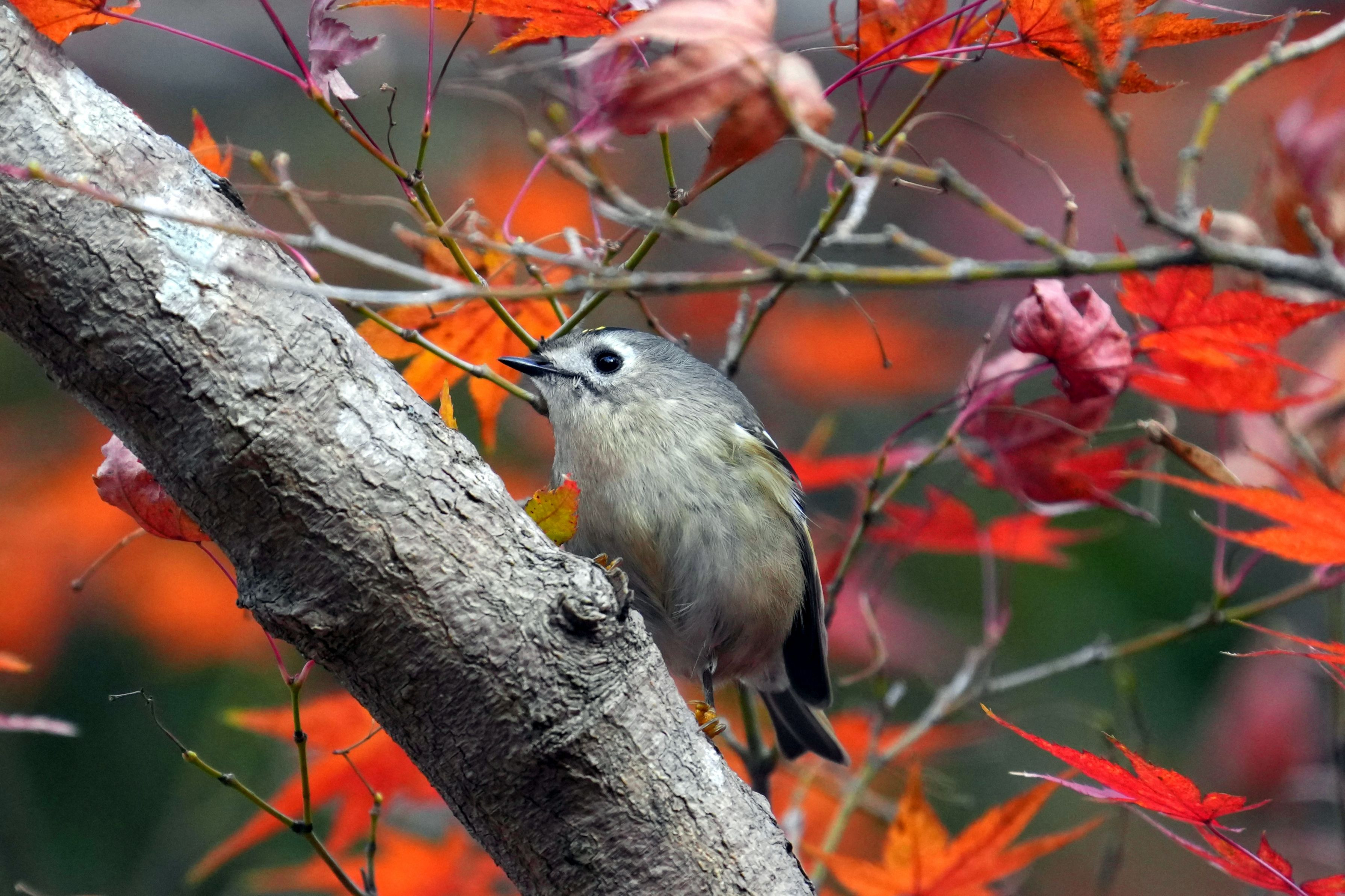 いつものモミジの木にたくさんの鳥たちが来てくれました。 その中にいたキクイタダキさんです。