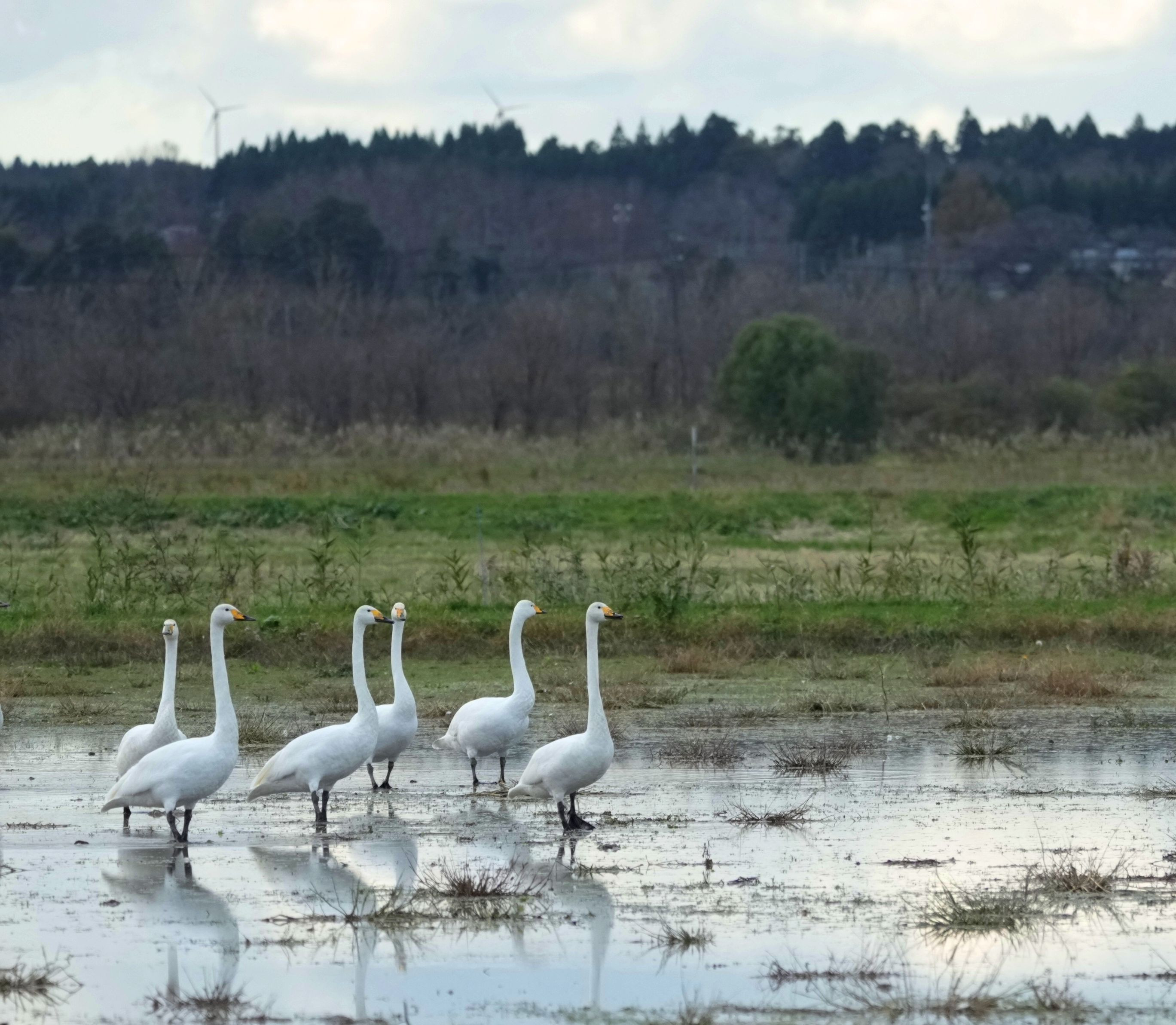オオハクが首を伸ばして 緊張し始めました。こうなると人間は彼等の傍から 踝を返し戻るしかないのです。夕方でしたので警戒心も強く これ以上近づいたら彼等の採餌を妨げてしまうので撤収しました。
